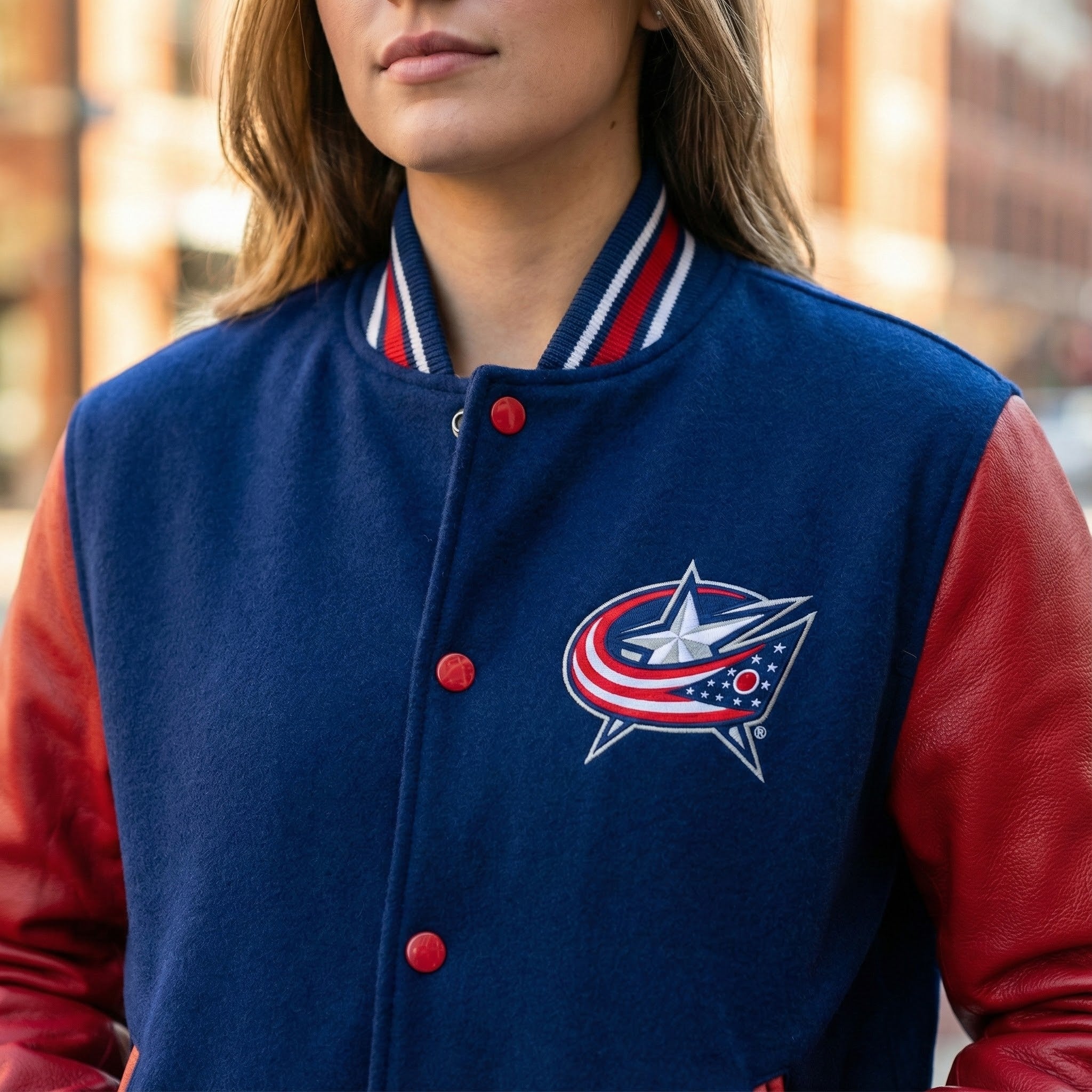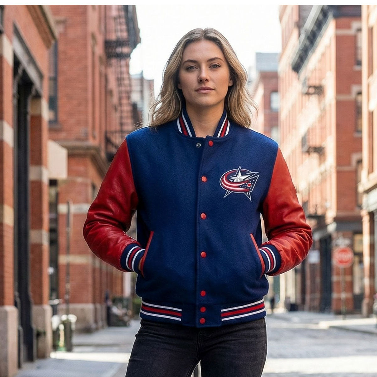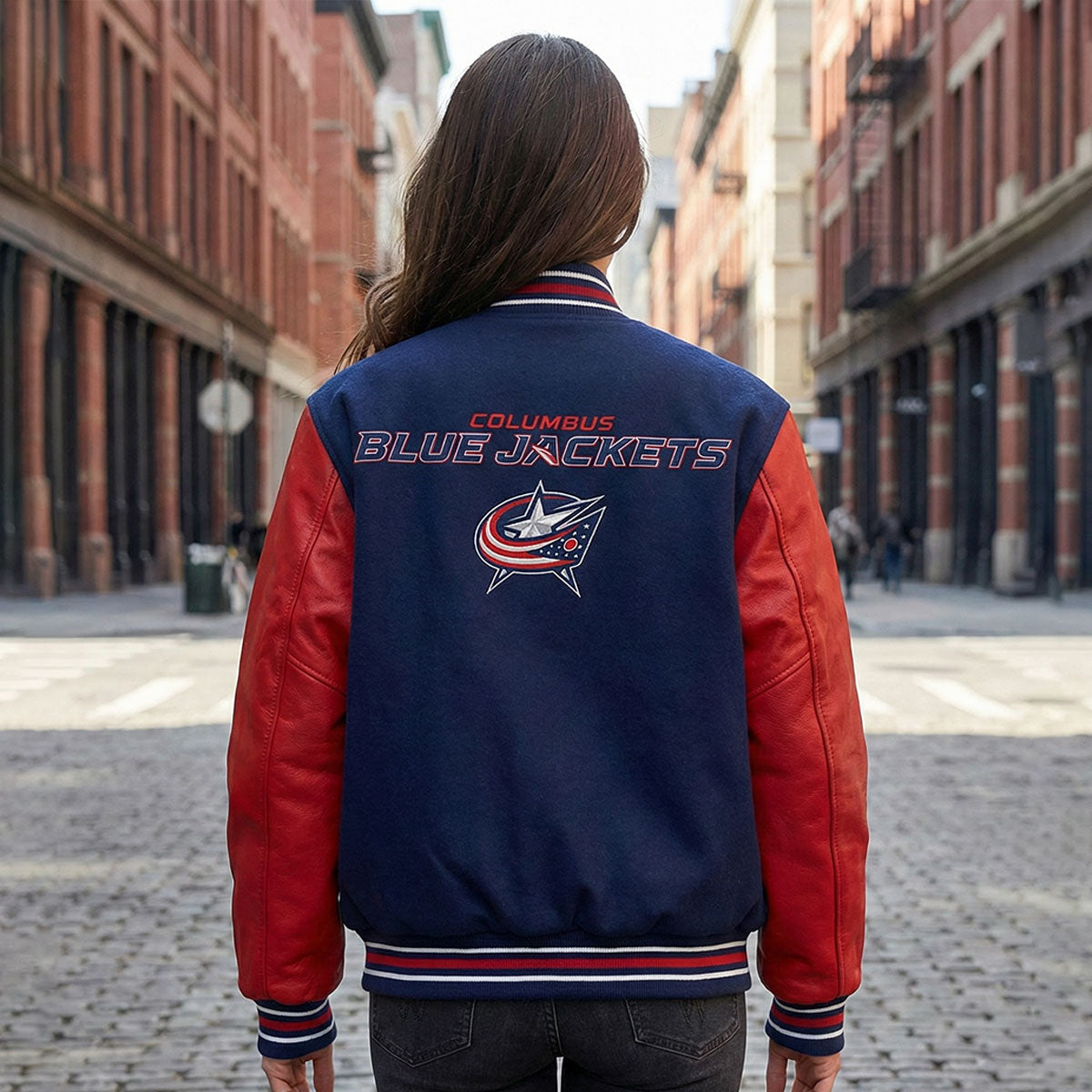 Columbus Blue Jackets Lettermen Varsity Jacket With Genuine Leather Sleeves blue and red