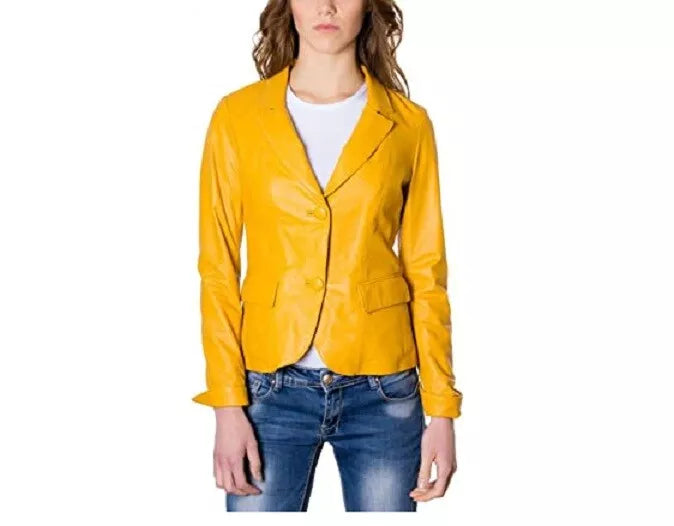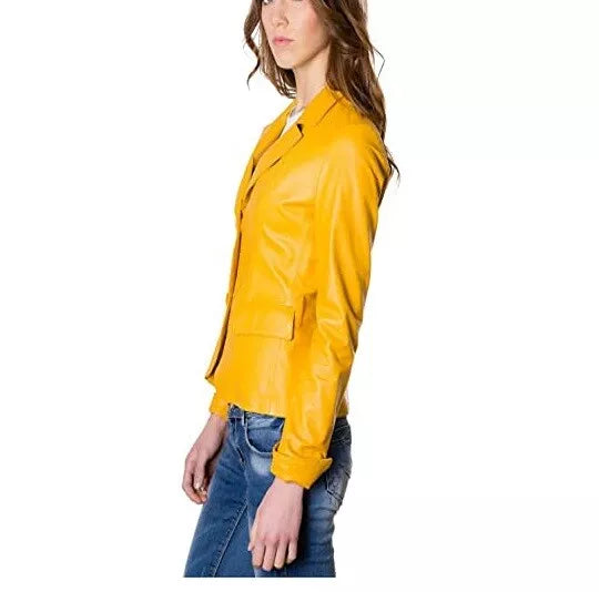 Leather Blazer Coat Jacket Women Lambskin Ladies Trench Biker Kim Fit Yellow