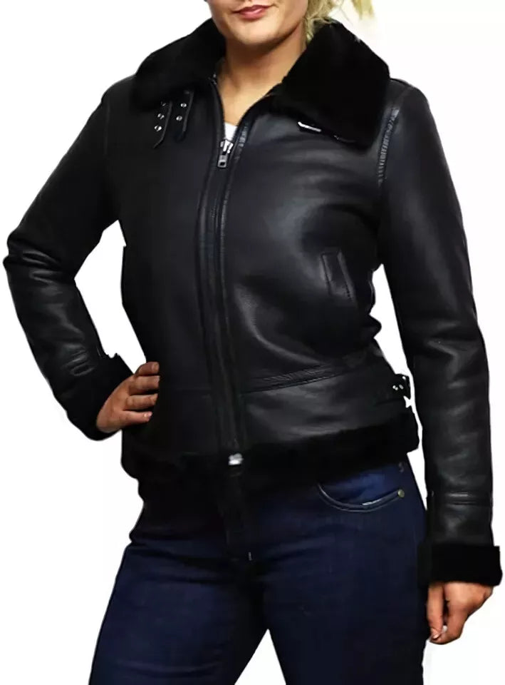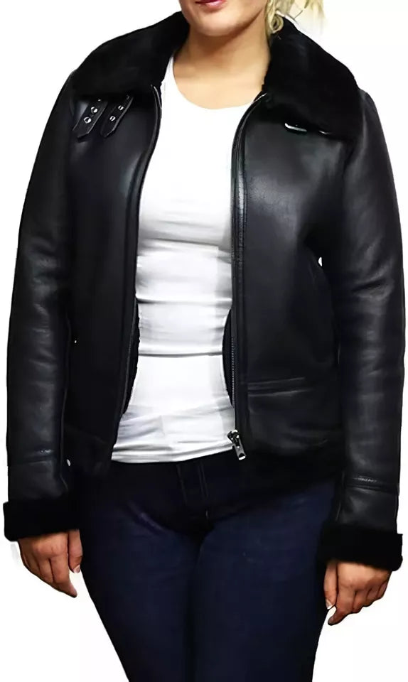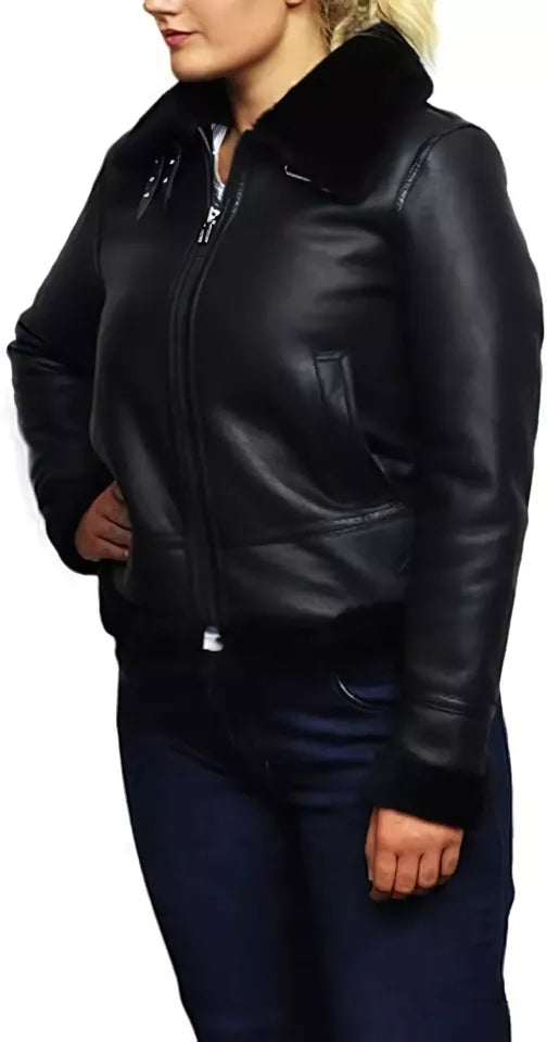 Women's Black Aviator Shearling Bomber Fur Sheepskin Black Leather Jacket