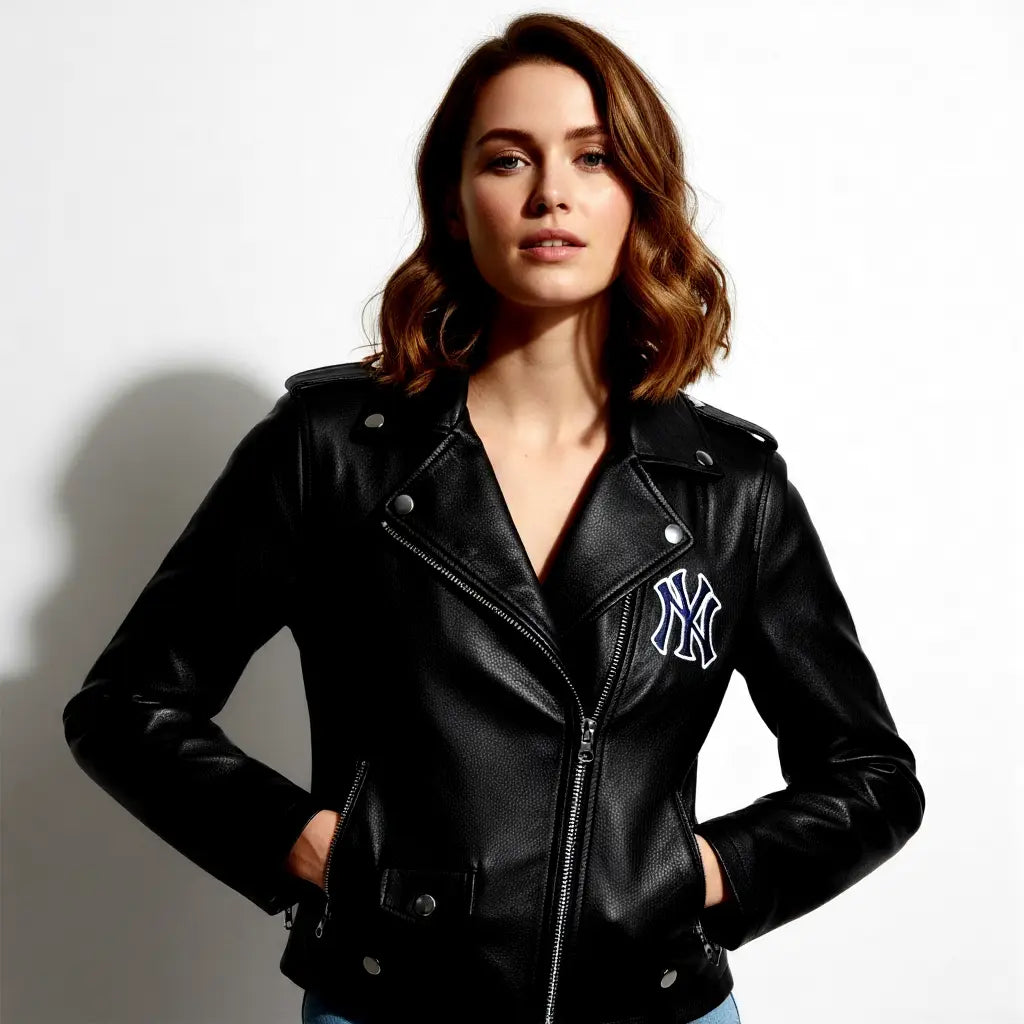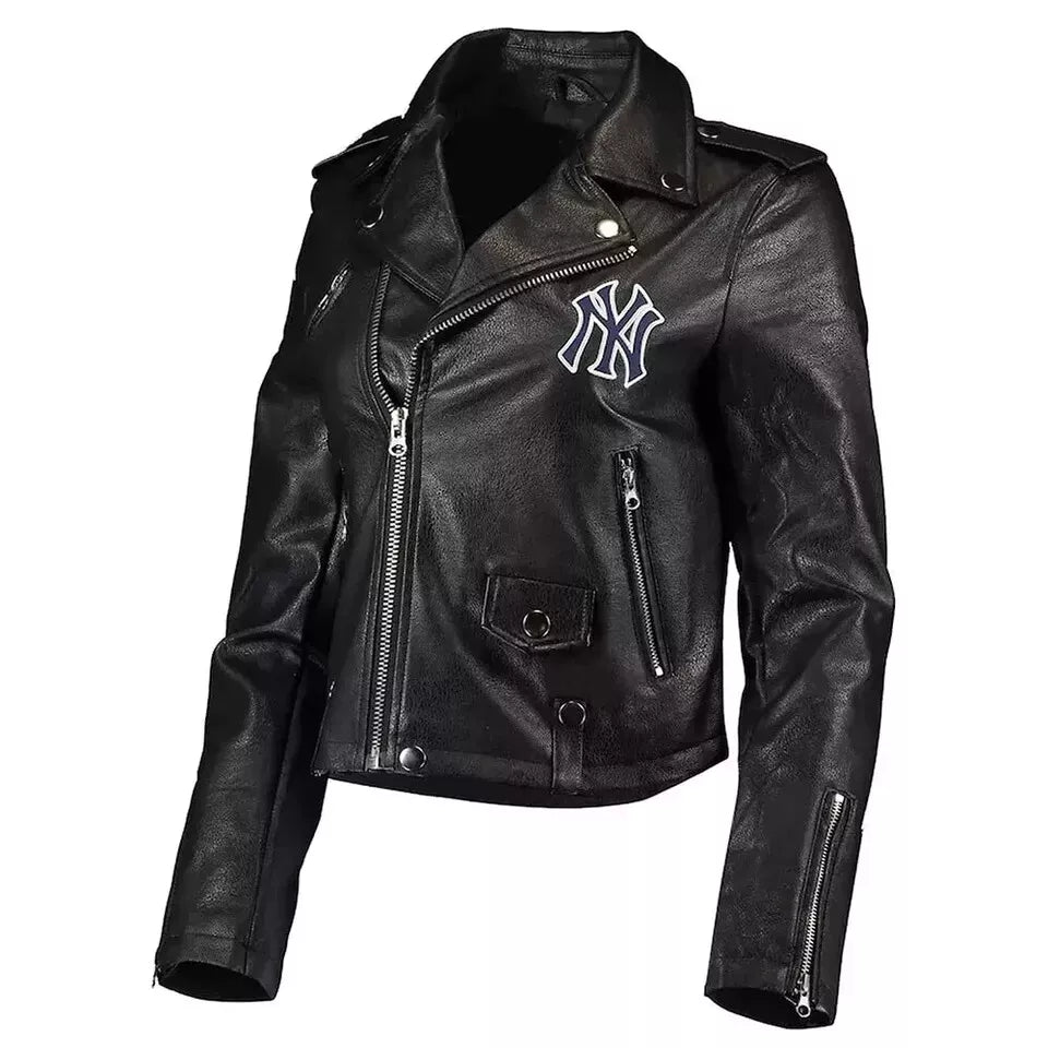 The Biker NY Yankees Black Leather Jacket is a bold and stylish fusion of sports culture and biker fashion. Crafted from genuine soft sheepskin leather, this jacket offers a luxurious feel while ensuring durability and comfort. The classic black color adds versatility, making it easy to pair with any outfit, while the NY Yankees logo adds a unique and sporty flair to the design. Ideal for motorcycle enthusiasts or anyone looking to add an edgy, sports-inspired touch to their wardrobe, this jacket is designed with biker-inspired details like a zip-up closure and durable stitching, making it both functional and fashionable.