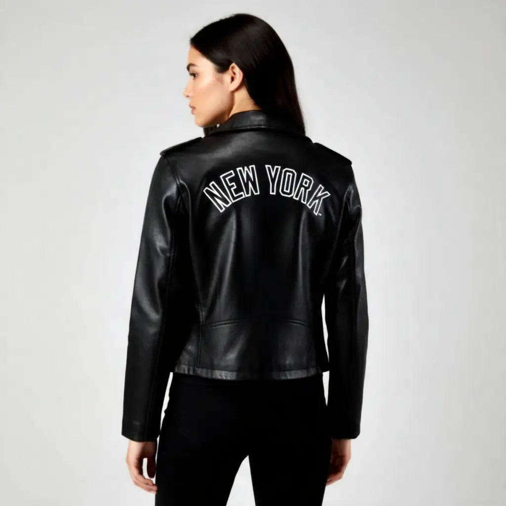 Biker NY Yankees Black Leather Jacket Genuine Soft Sheepskin