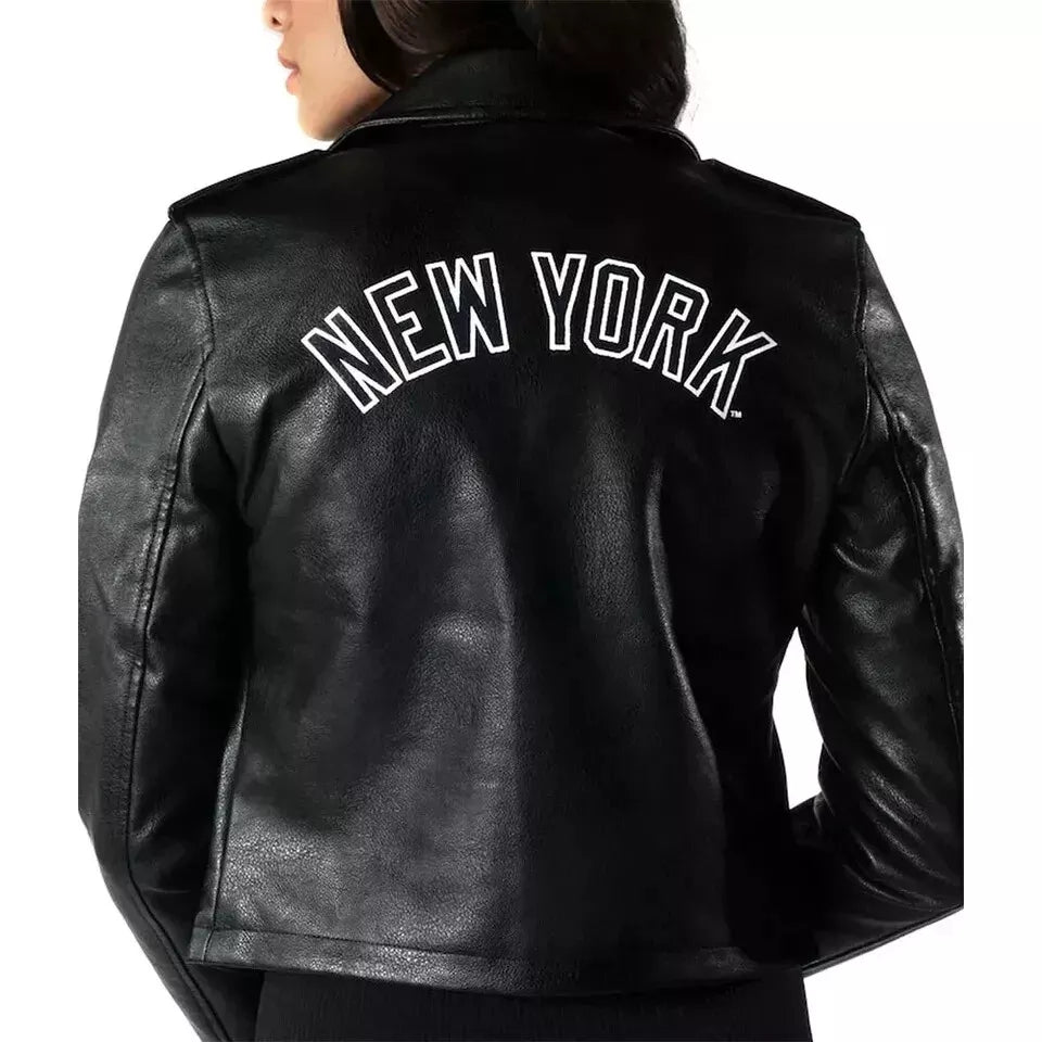 Features the iconic NY Yankees logo, combining sports culture with biker fashion.