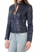 Leather Jacket Women Biker Motorcycle Women Soft Fit Size Real Blue