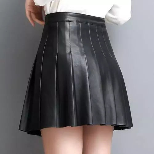 Women Genuine Leather Skirt Black Mini Pleated High Waist Slim A-line Skirt