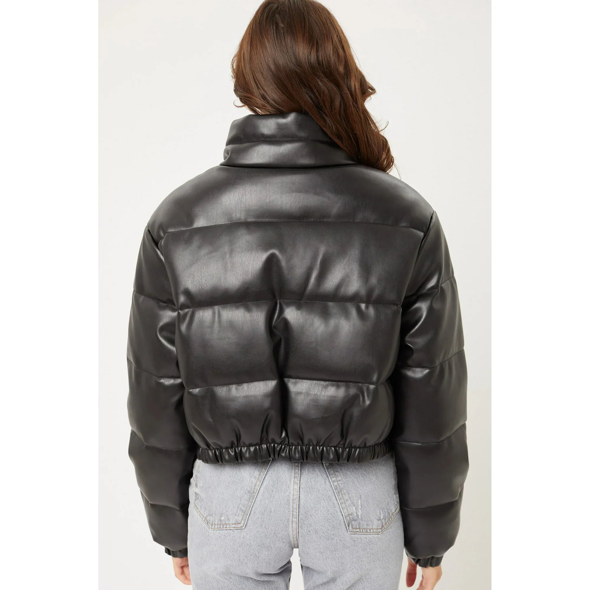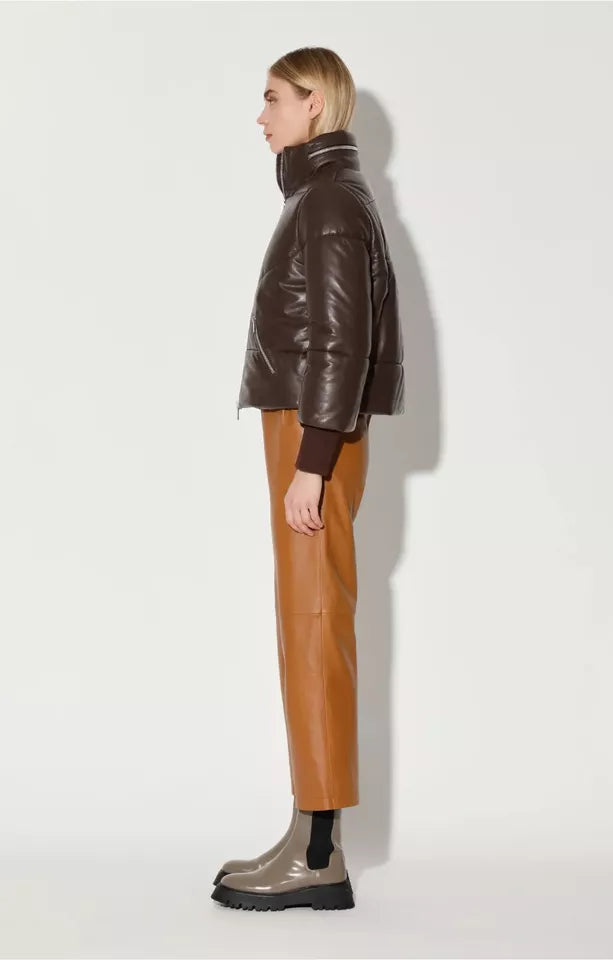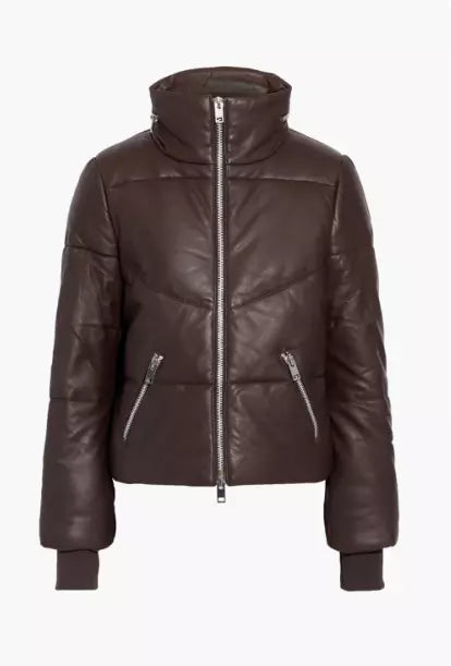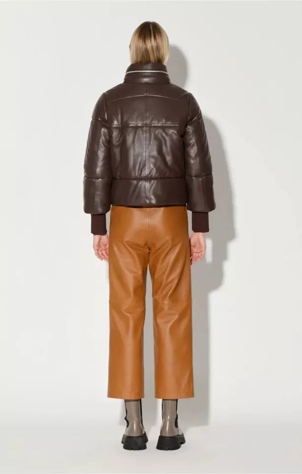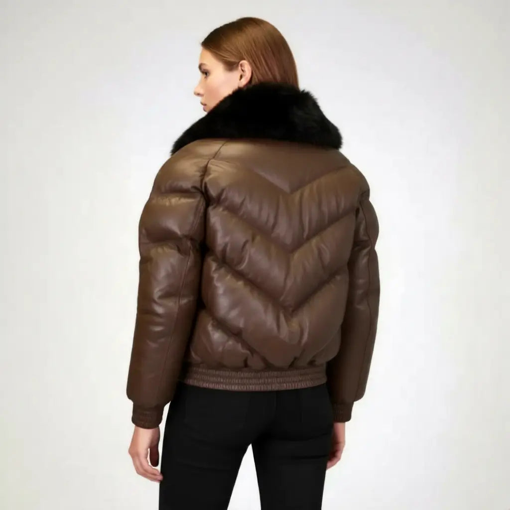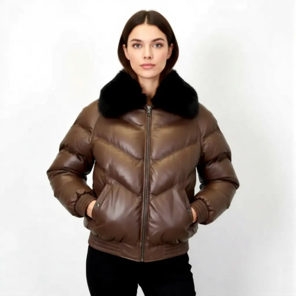 Women Vegan Leather Mocha Brown Puffer Jacket
