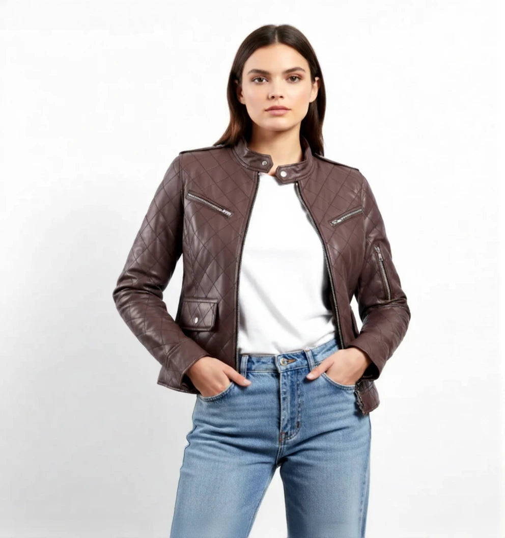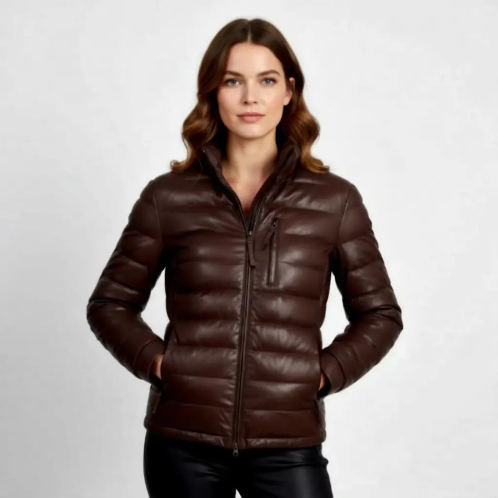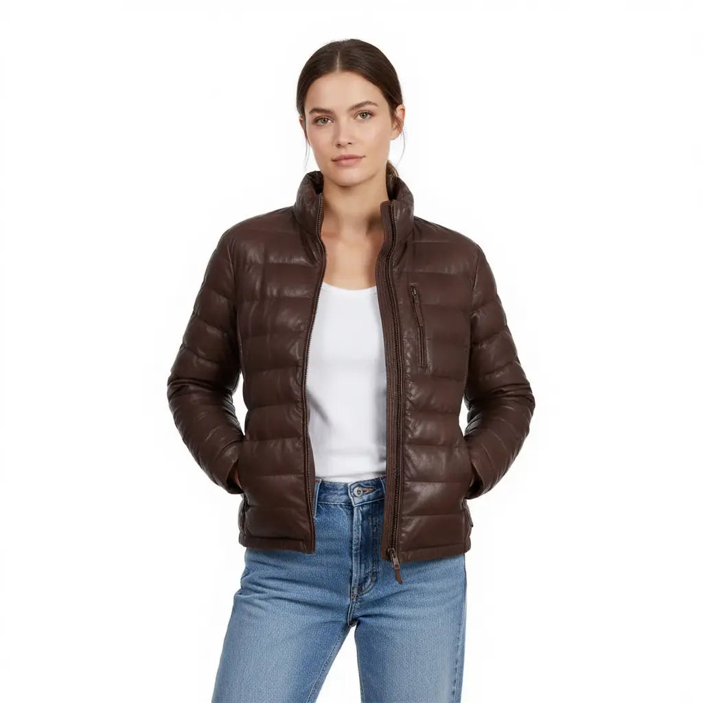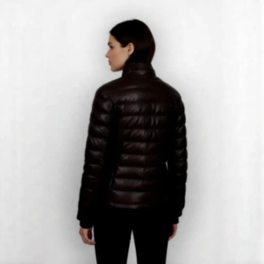 Women Brown Edwina Quilted Lamb Leather Puffer Bomber Jacket