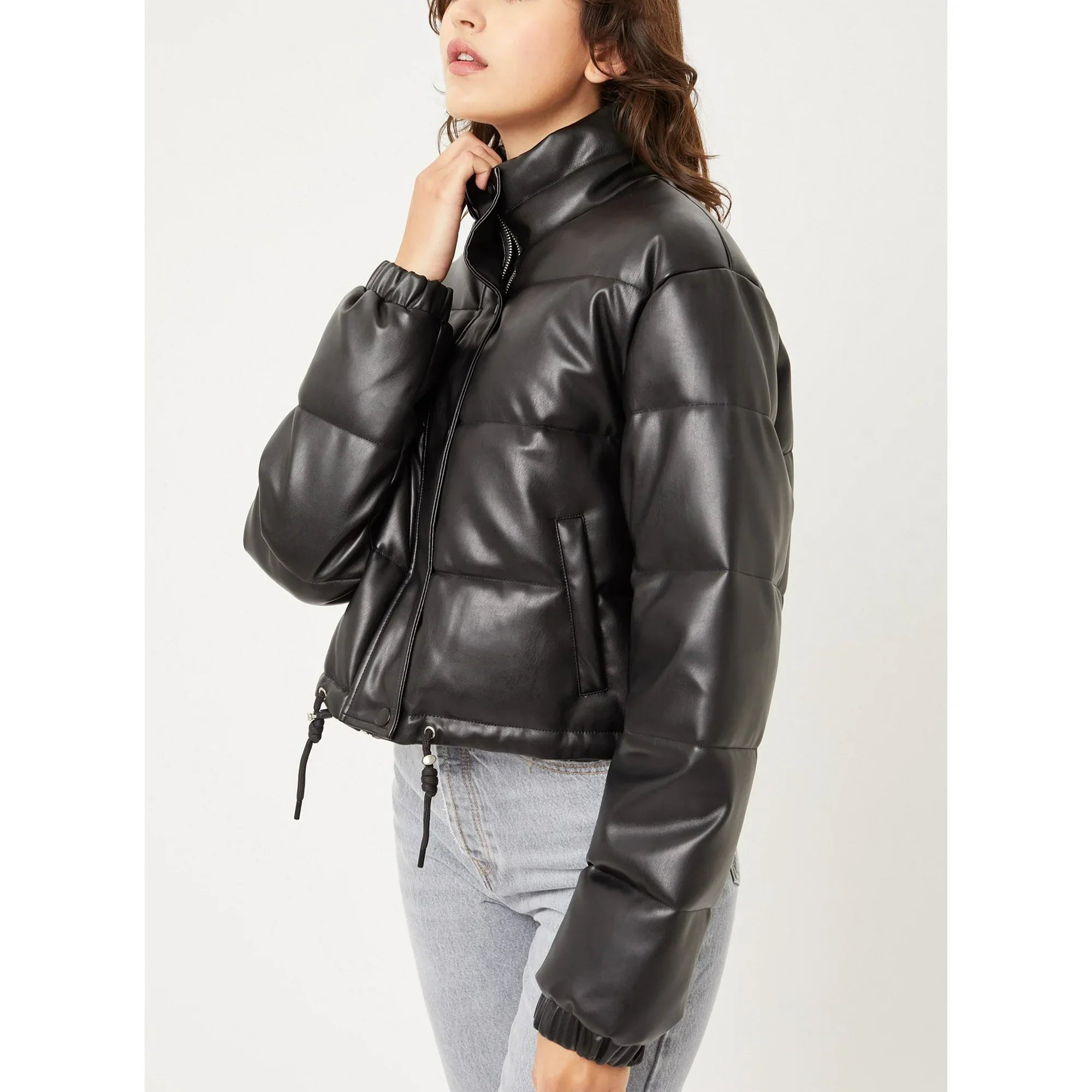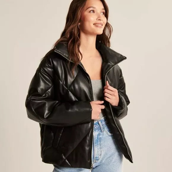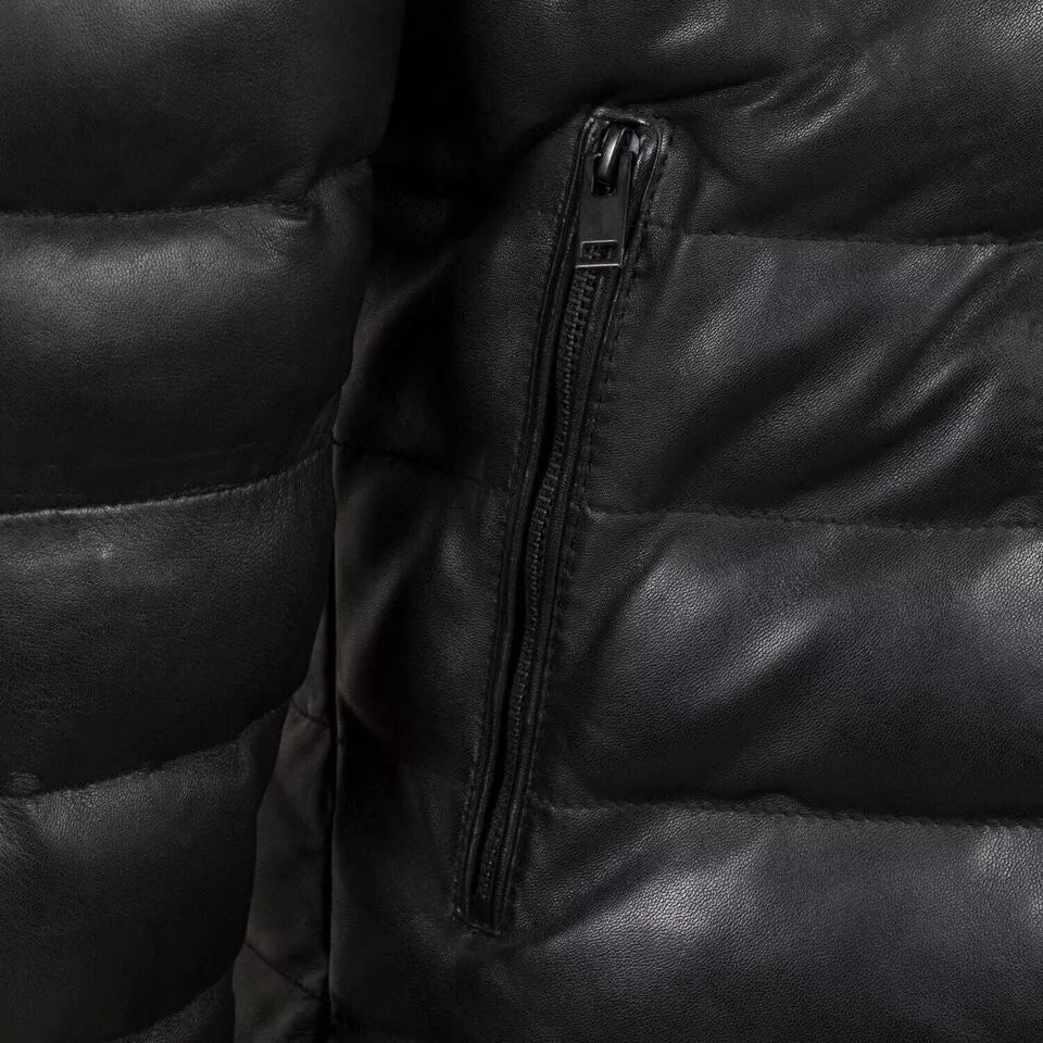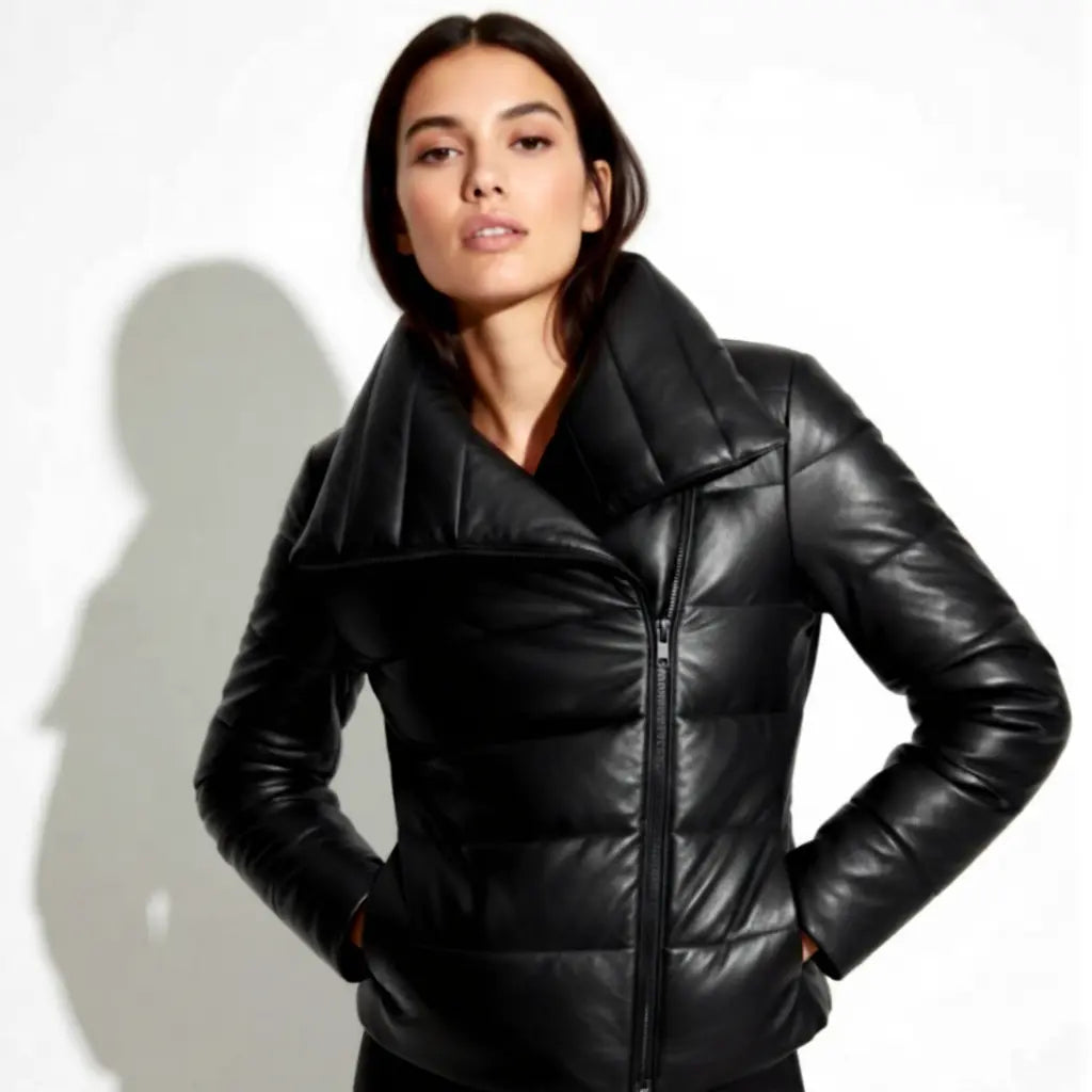 Women Black Leather Puffer Quilted Jacket With Side Zipper & Pocket Zip Up Leather jacket