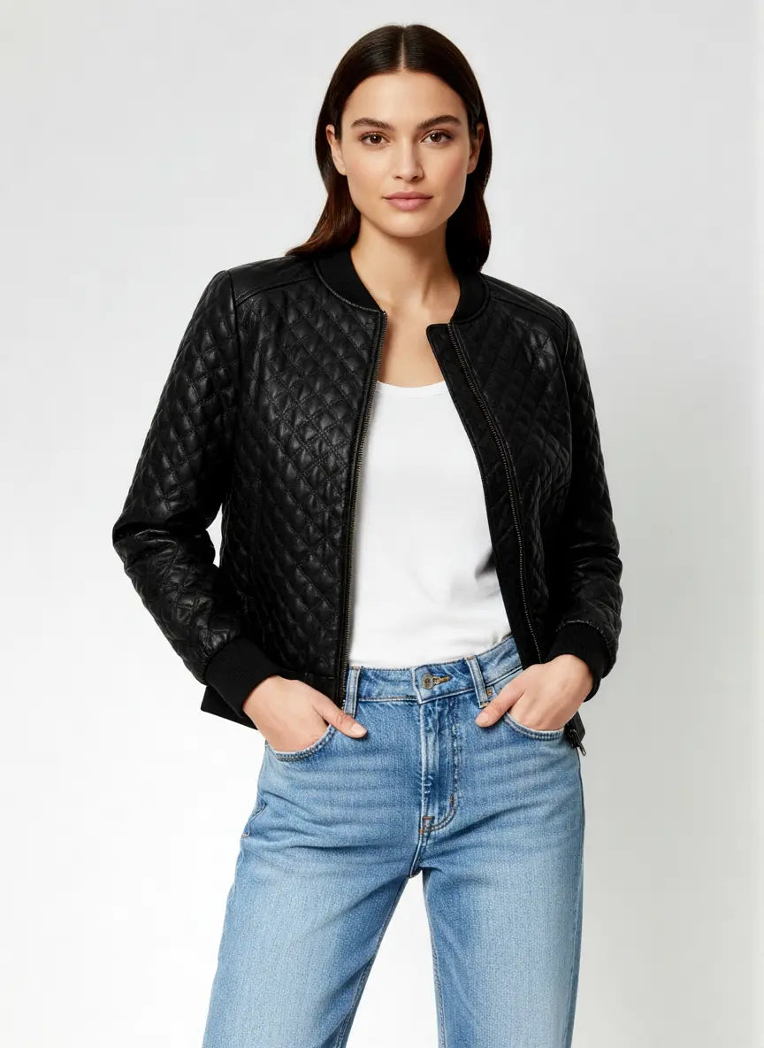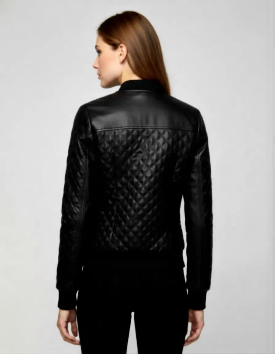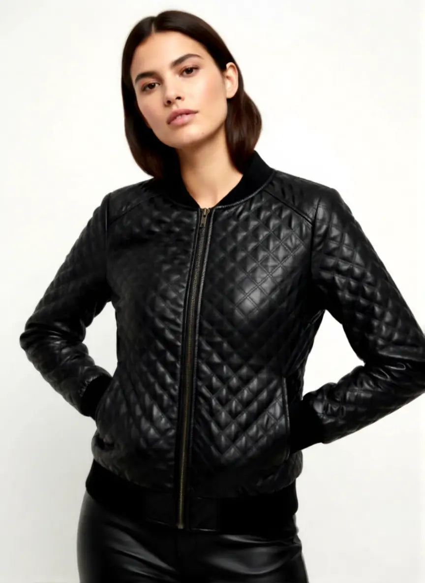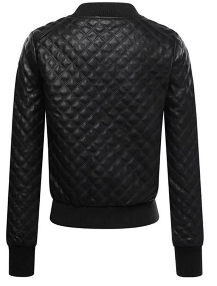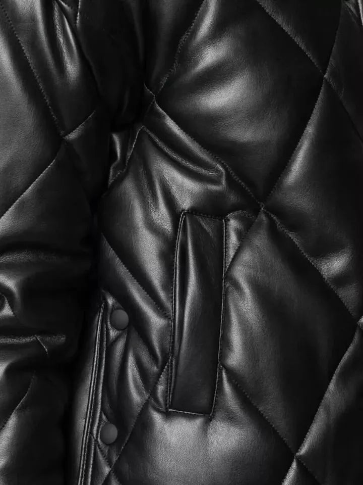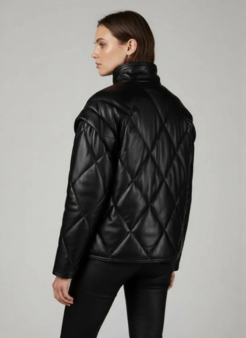 Women Leather Diamond Quilted Puffer Jacket - Black
