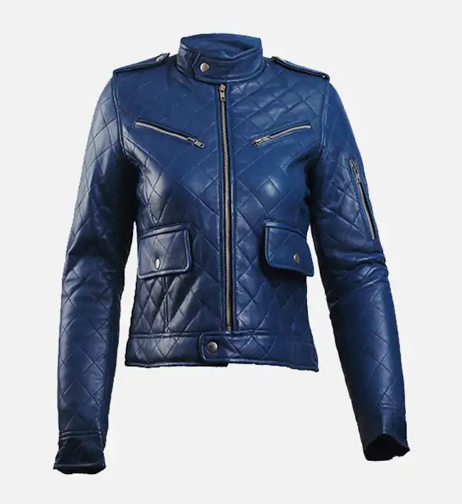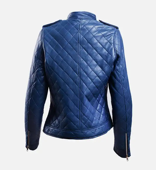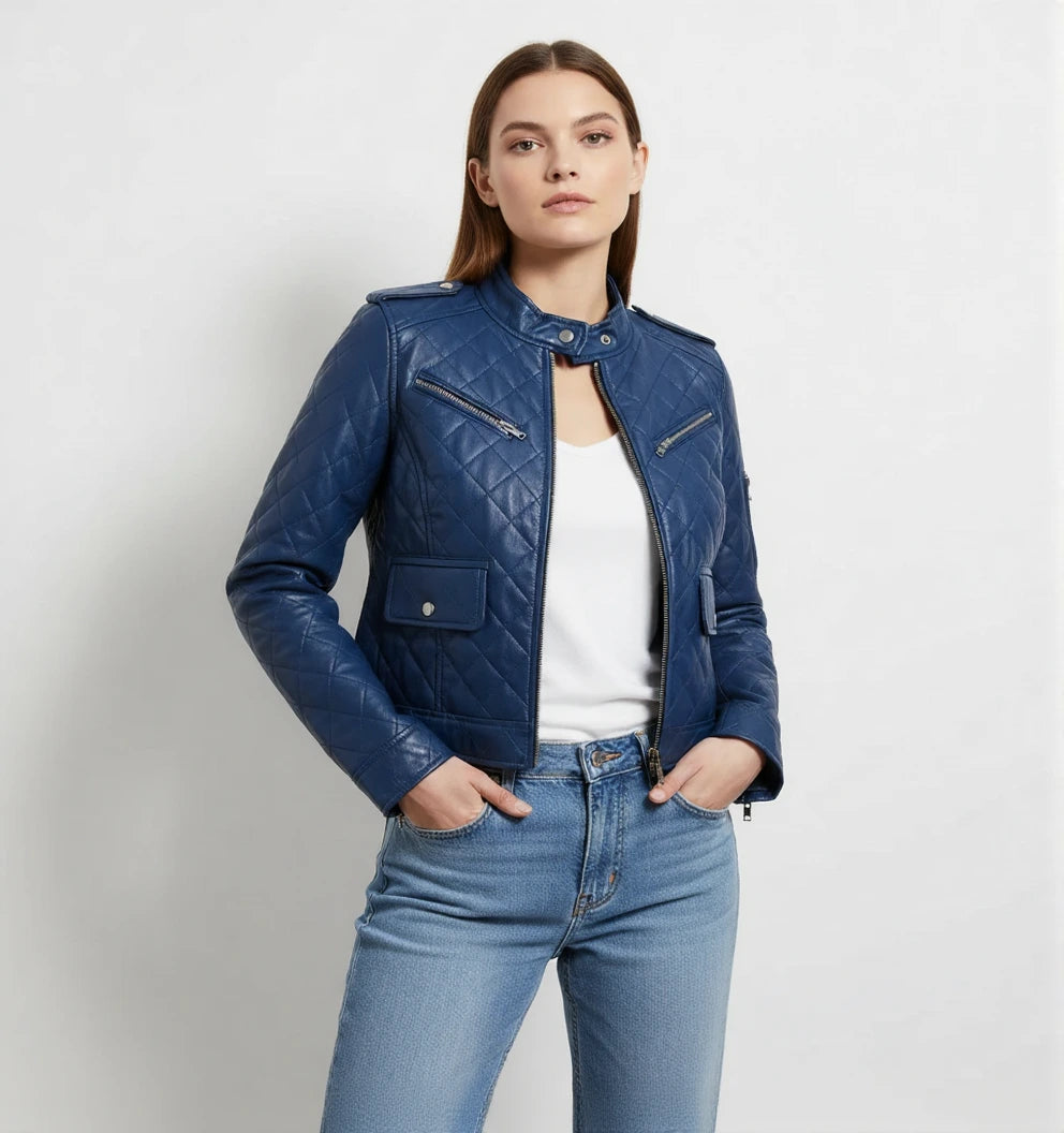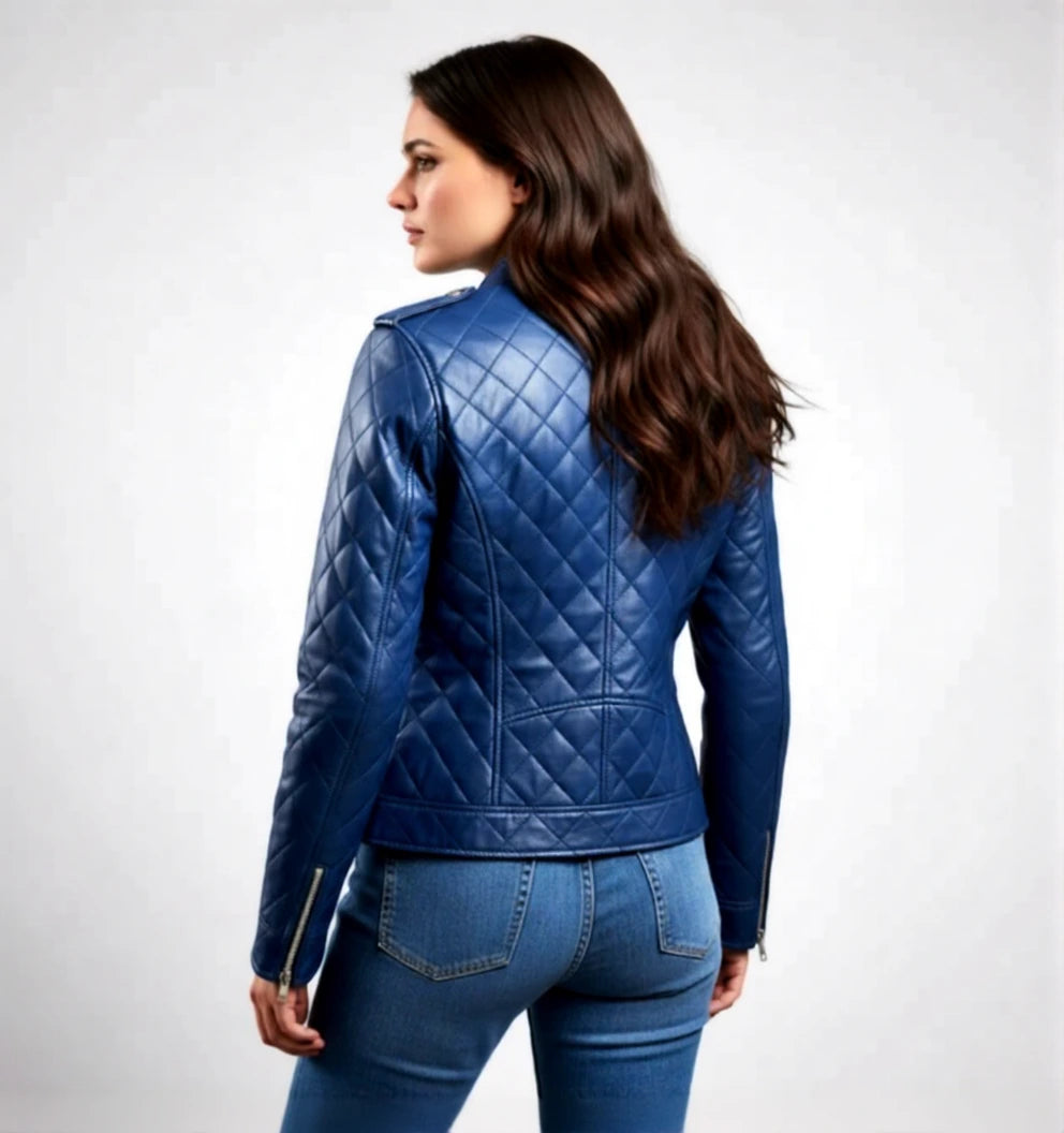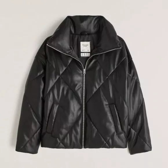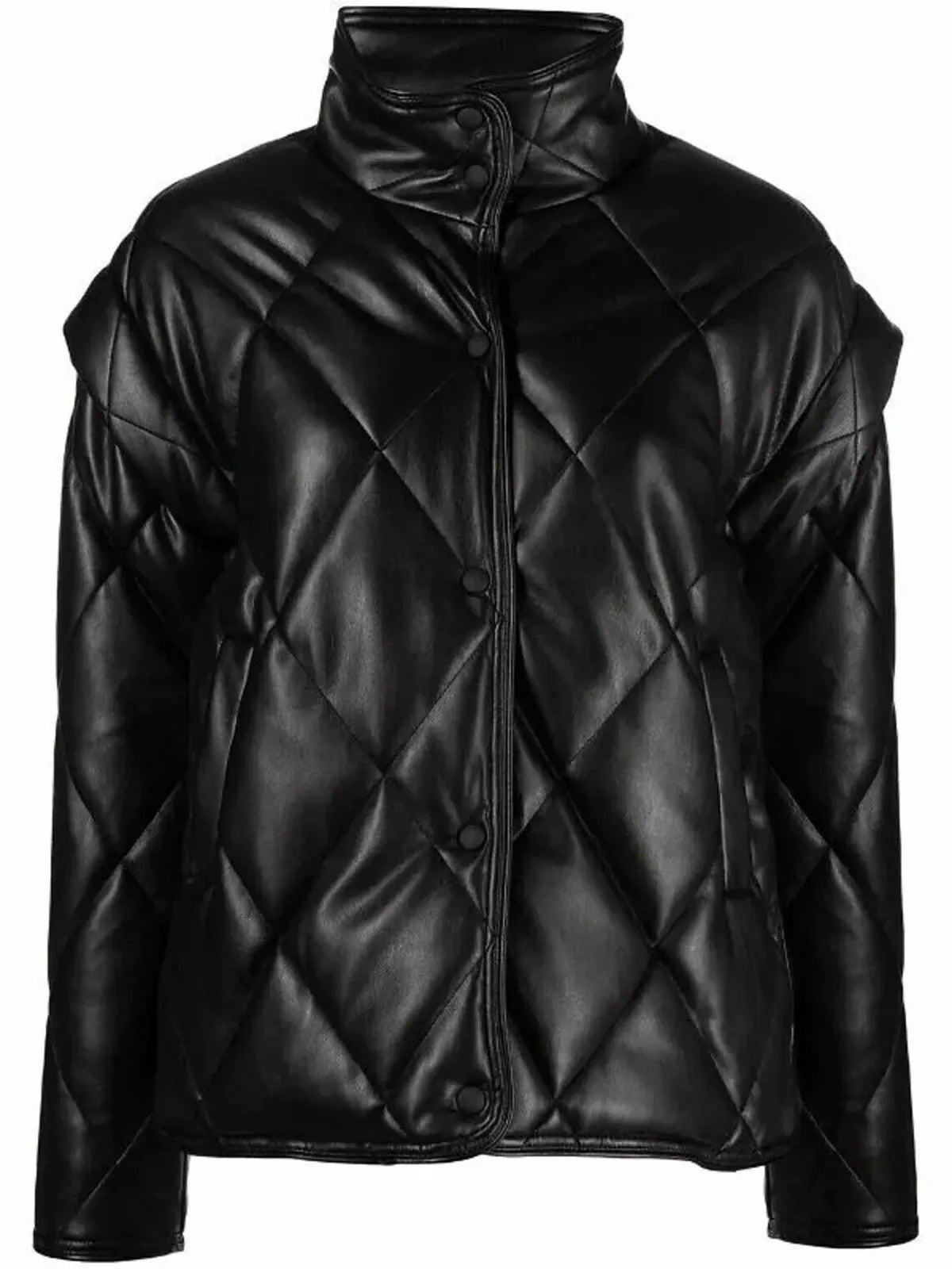 Women Leather Diamond Quilted Puffer Jacket - Black