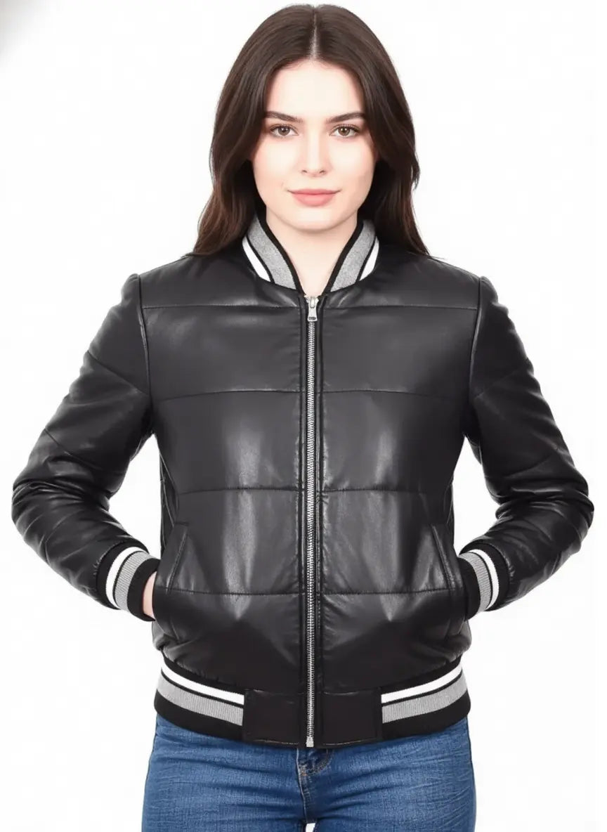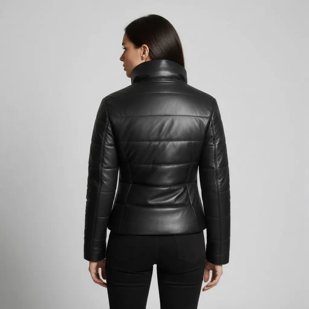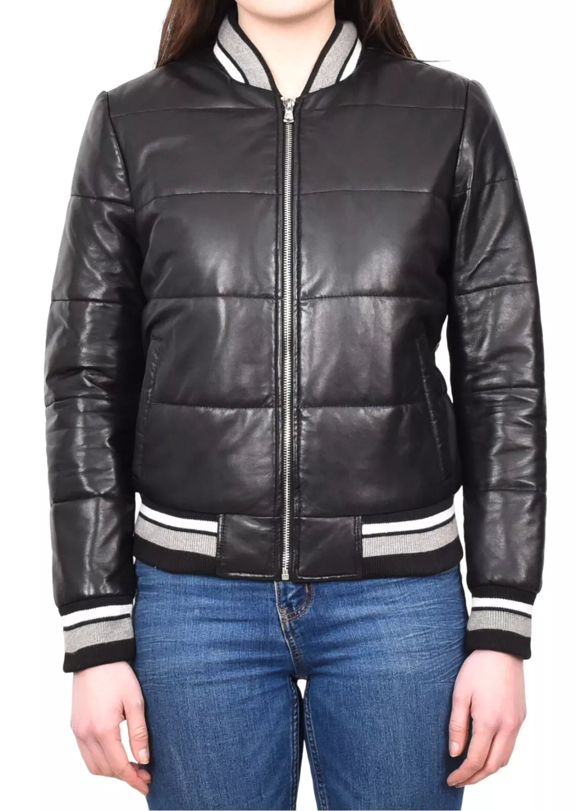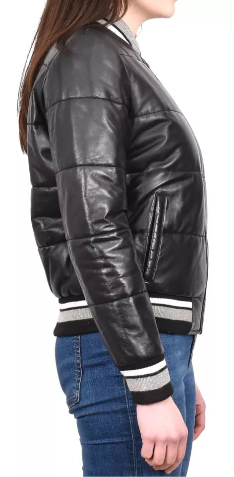 Women Black Leather Puffer Jacket Genuine Napa Leather Quilted Bomber Jacket