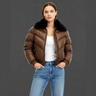 Women Real Lambskin Leather Brown Leather Bomber Jacket