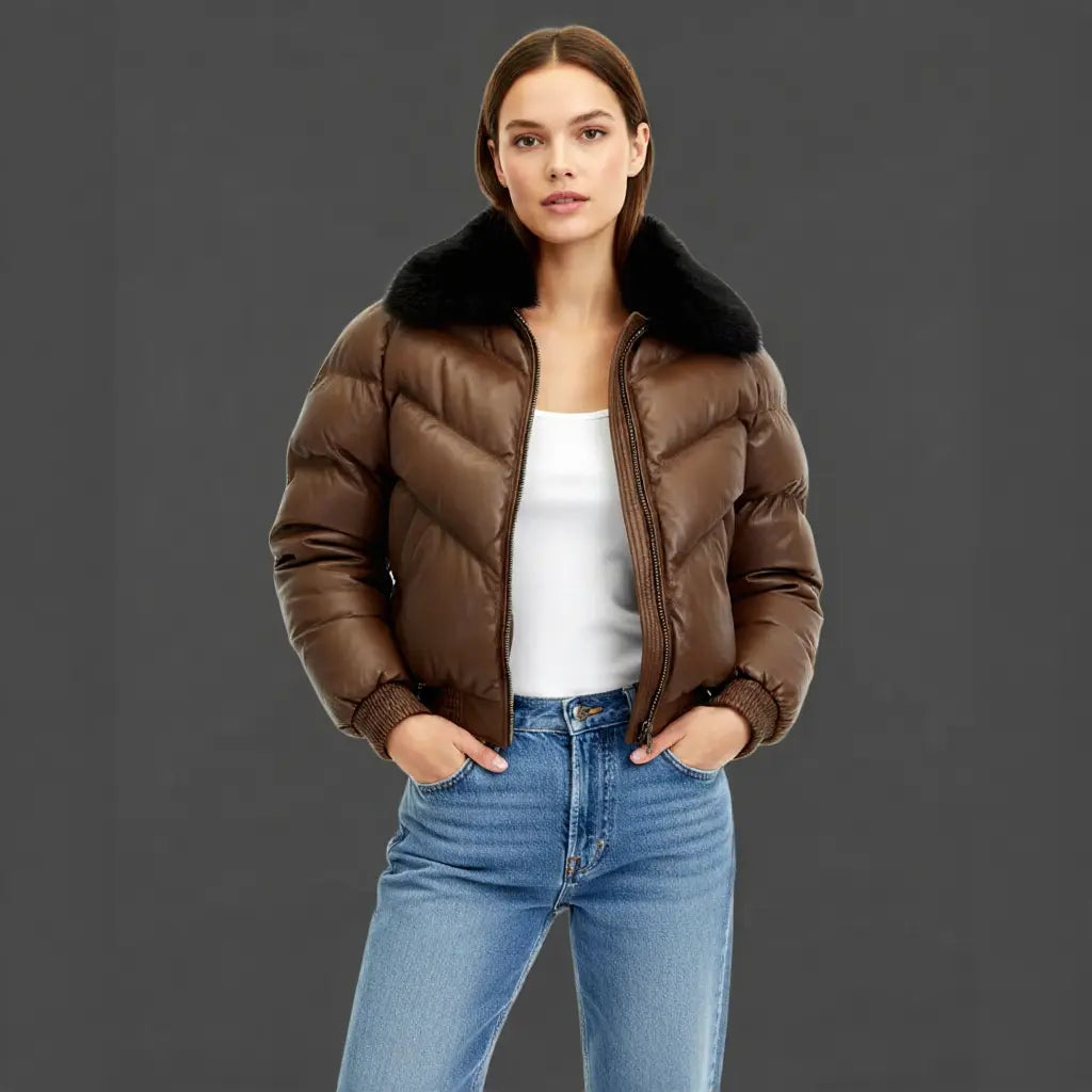 The Women’s Real Lambskin Leather Brown Bomber Jacket is an essential addition to your wardrobe. Its premium leather construction and classic bomber style make it a versatile and stylish choice for any occasion, ensuring you stay both comfortable and fashionable all year round.
