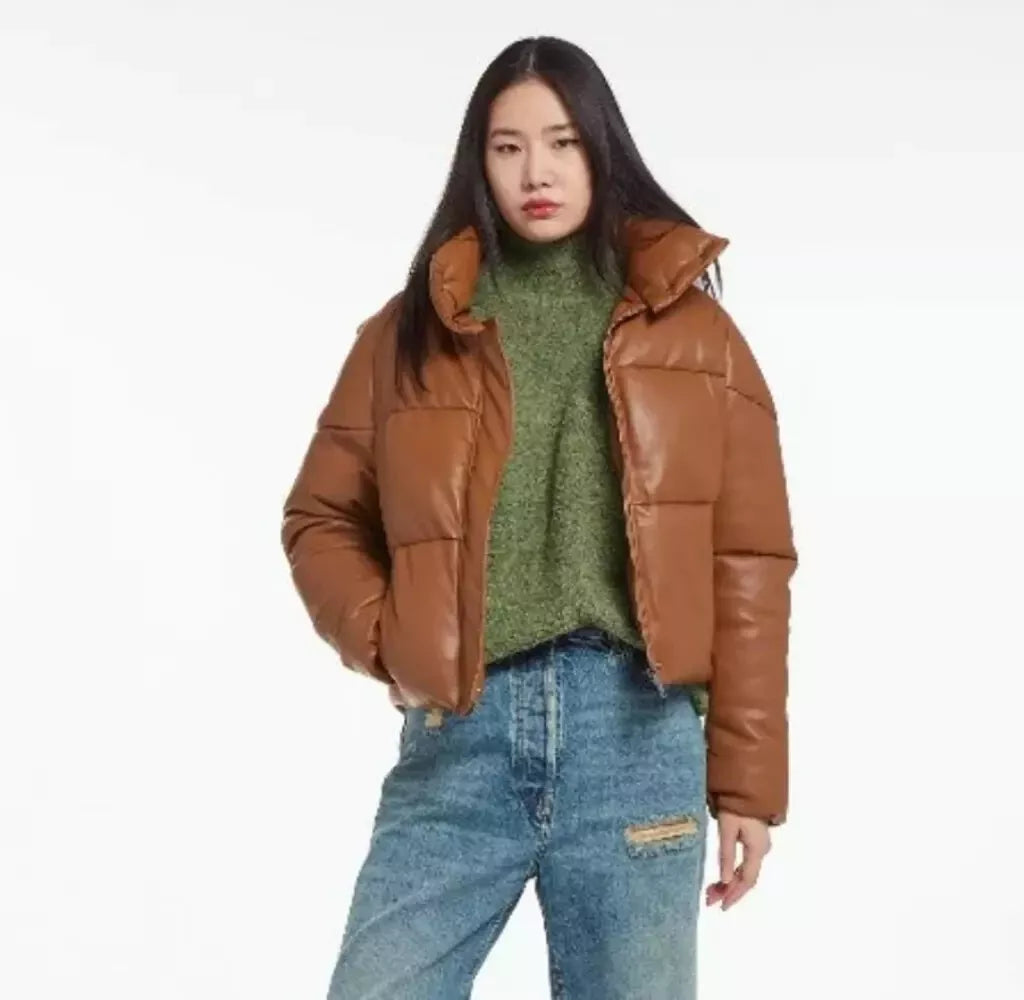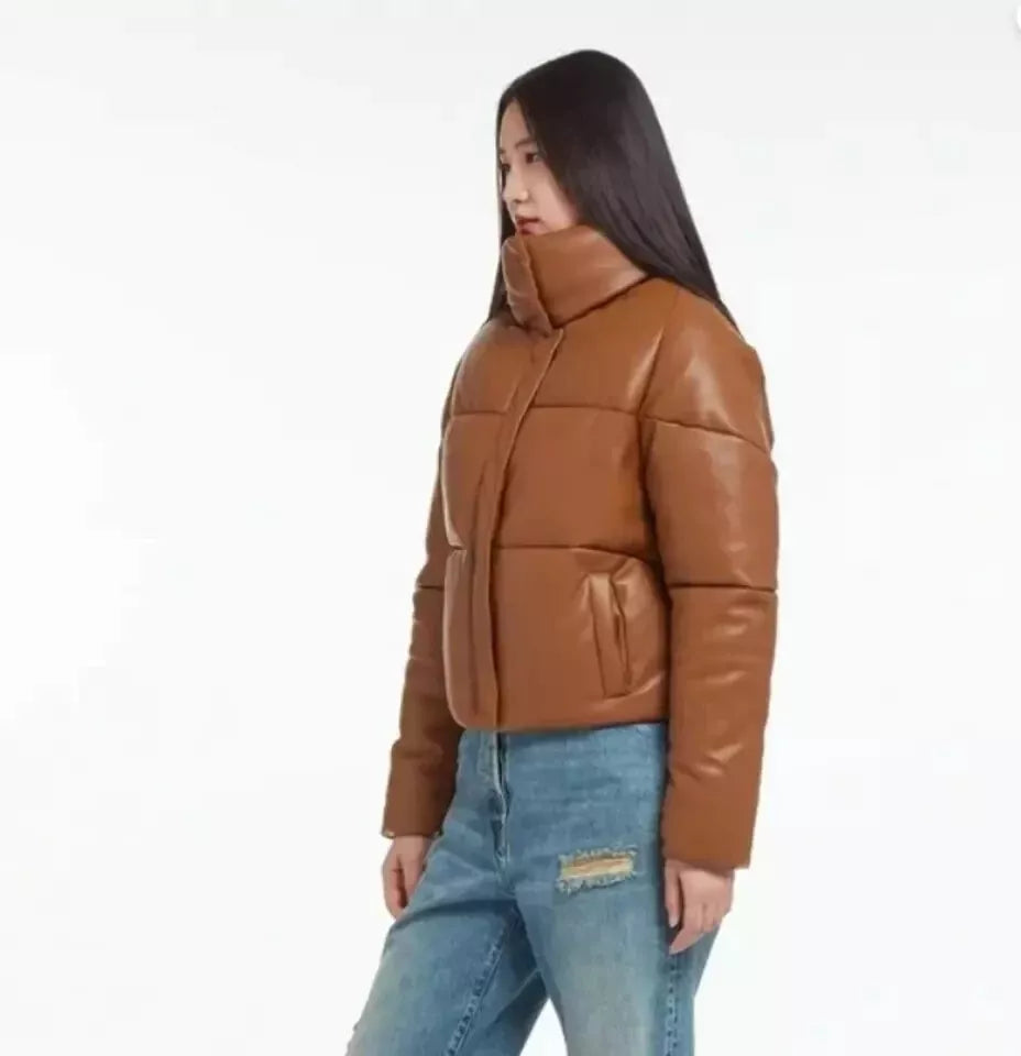 Women Vegan Leather Mocha Brown Puffer Jacket