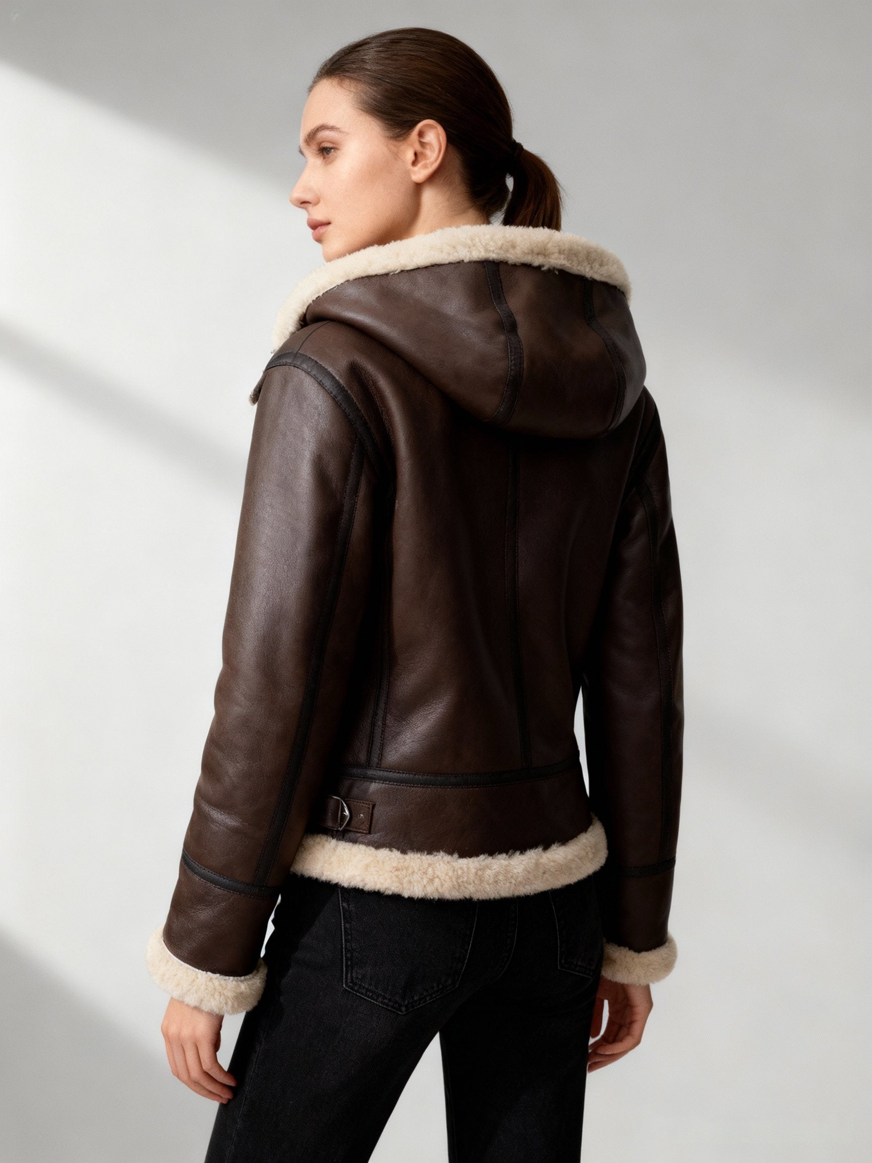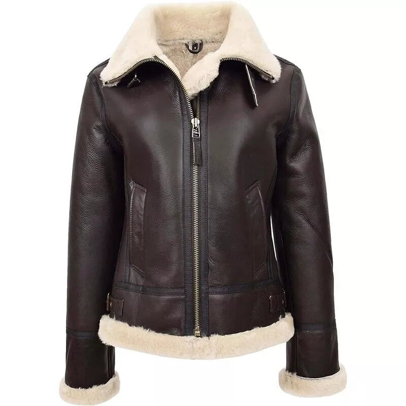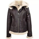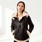 The Women's Real Sheepskin Flying Jacket is a stylish and warm aviator-inspired coat. Made from genuine brown sheepskin leather and lined with soft shearling, this B3 pilot jacket features a cozy hood for added warmth, making it perfect for cold weather and aviation enthusiasts.