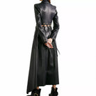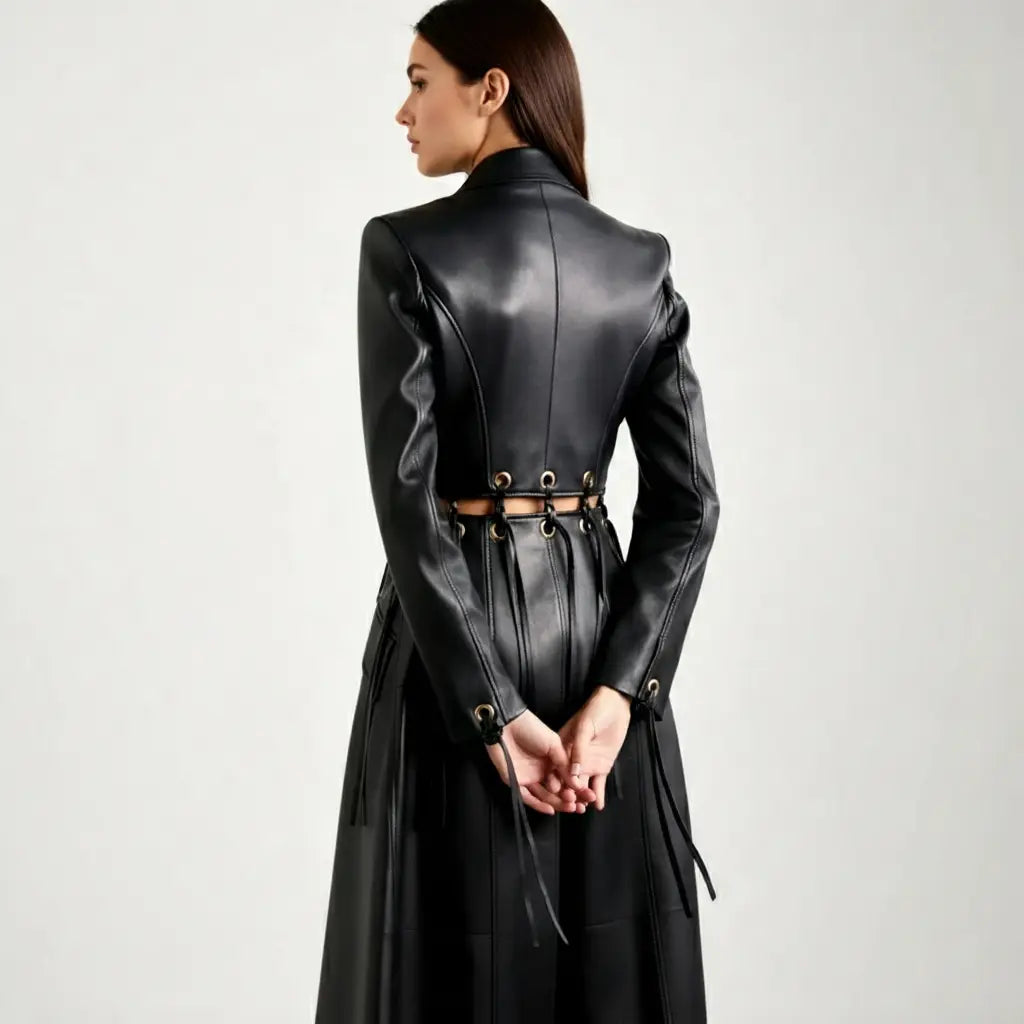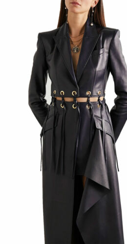 The Women’s Black Lambskin Real Leather Dress Fringed Eyelet-Embellished Long Overcoat is the ultimate statement piece for those looking to combine luxury, modern design, and unique detailing. Perfect for any fashion-forward woman, this overcoat offers a sophisticated yet edgy twist on a classic leather look, ensuring you stand out wherever you go