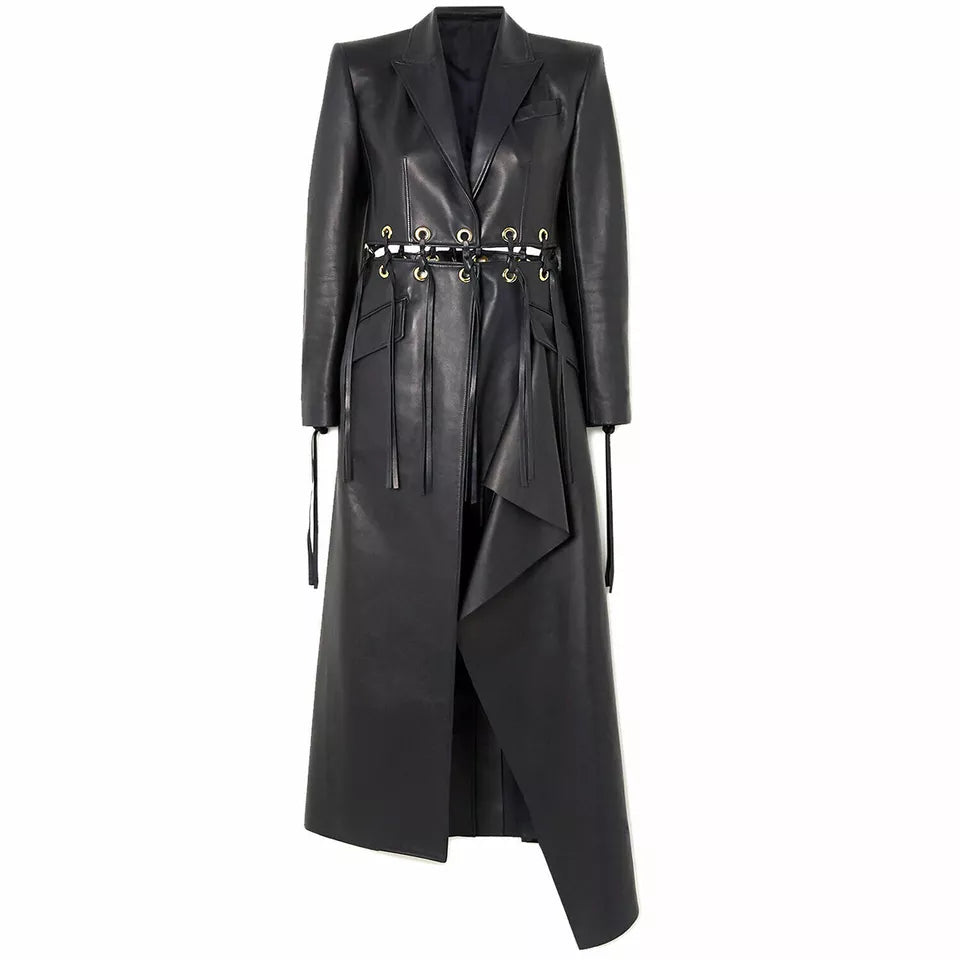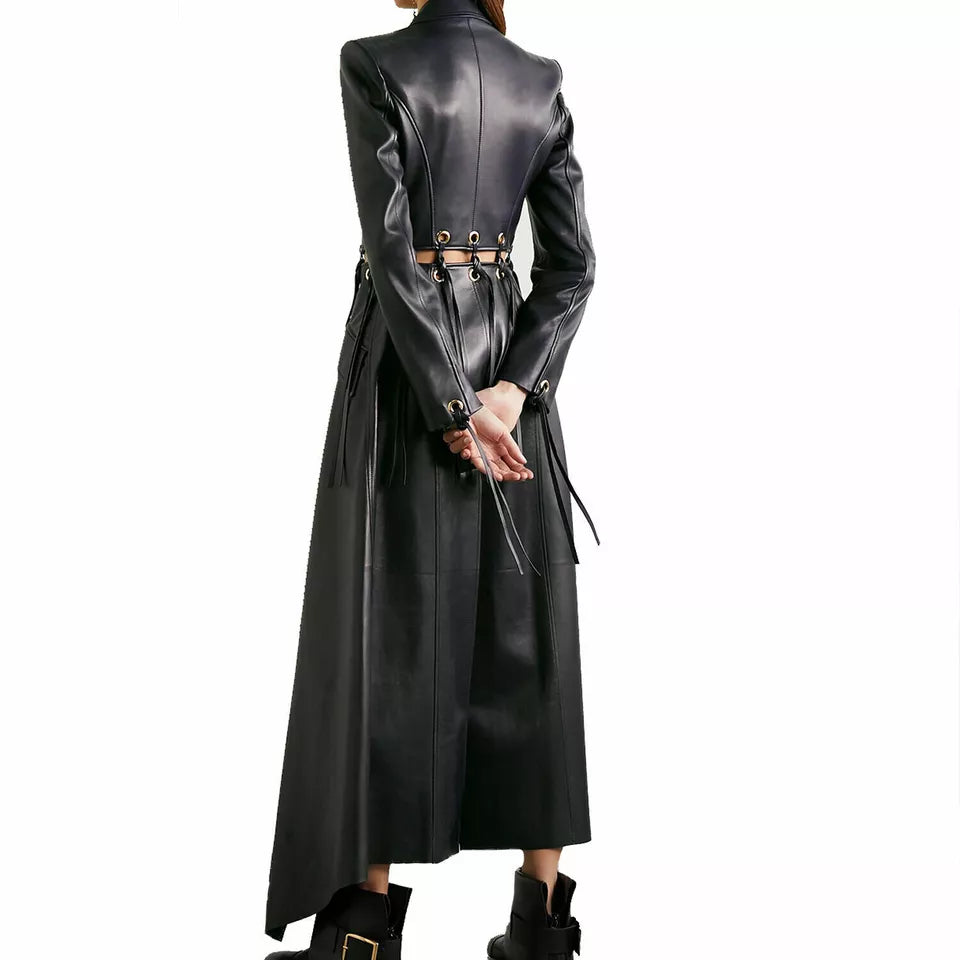 Women Black Lambskin Real Leather Dress Fringed Eyelet-embellished Long Overcoat