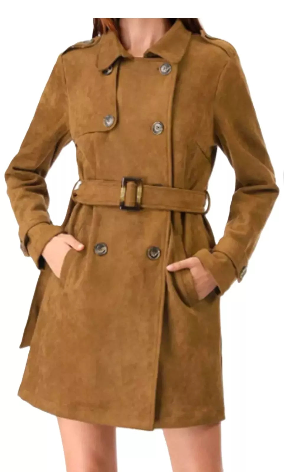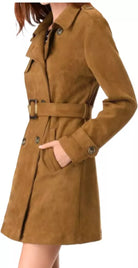 Women's 100% Pure Suede Leather Brown Trench Coat Soft Suede Coat Winter Jacket
