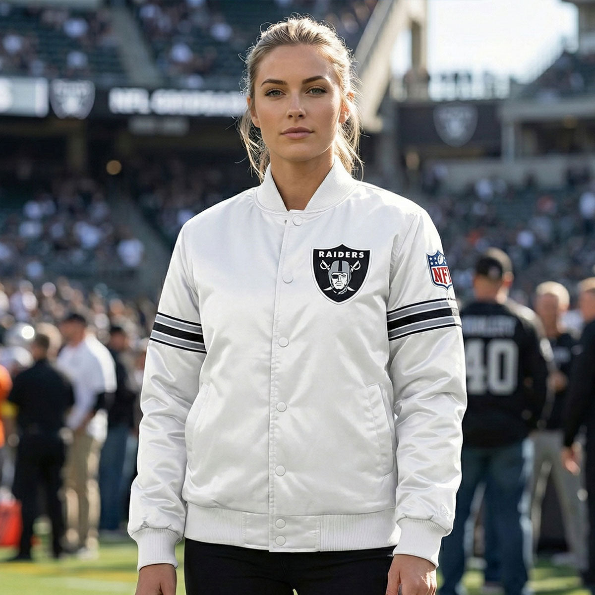 Whether you're heading to Allegiant Stadium, watching the game with friends, or adding a statement piece to your everyday wardrobe, this varsity jacket delivers authentic team spirit with premium quality. The combination of white satin sheen, embroidered details, and classic letterman silhouette makes this jacket a standout addition to any Raiders fan's collection.