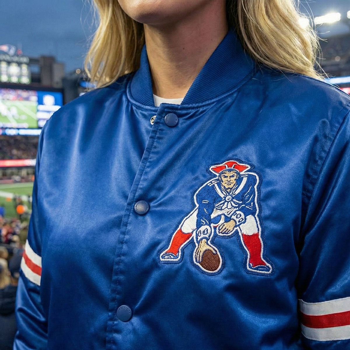 • Satin Shell – Smooth, lustrous blue fabric with a refined sheen in iconic Patriots colors
