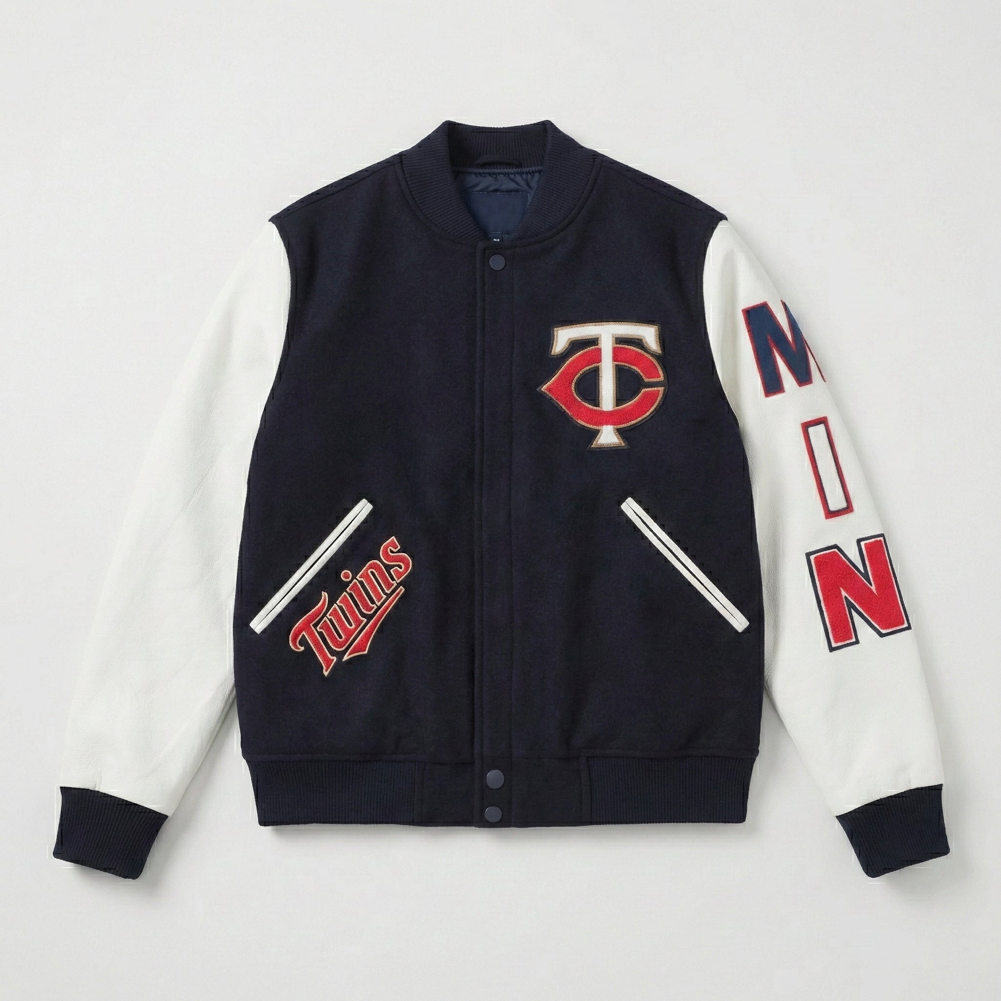 Celebrate your Minnesota Twins pride with the Letterman Minnesota Twins Varsity Jacket, a perfect blend of classic style and team spirit. This jacket features a navy blue wool body complemented by genuine leather sleeves in contrasting colors, creating a timeless varsity look. The iconic Minnesota Twins logo is prominently displayed, showcasing your loyalty to the team. Whether you're at the ballpark or out on the town, this jacket lets you represent the Twins with style and confidence.
