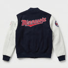 Crafted for both comfort and durability, the soft wool body provides warmth, while the genuine leather sleeves add a premium touch. Ribbed cuffs and collar ensure a snug fit, keeping you cozy during cooler weather. The navy and contrasting color scheme offers versatility, making it easy to pair with various outfits. This varsity jacket is an essential addition to any Twins fan's wardrobe.