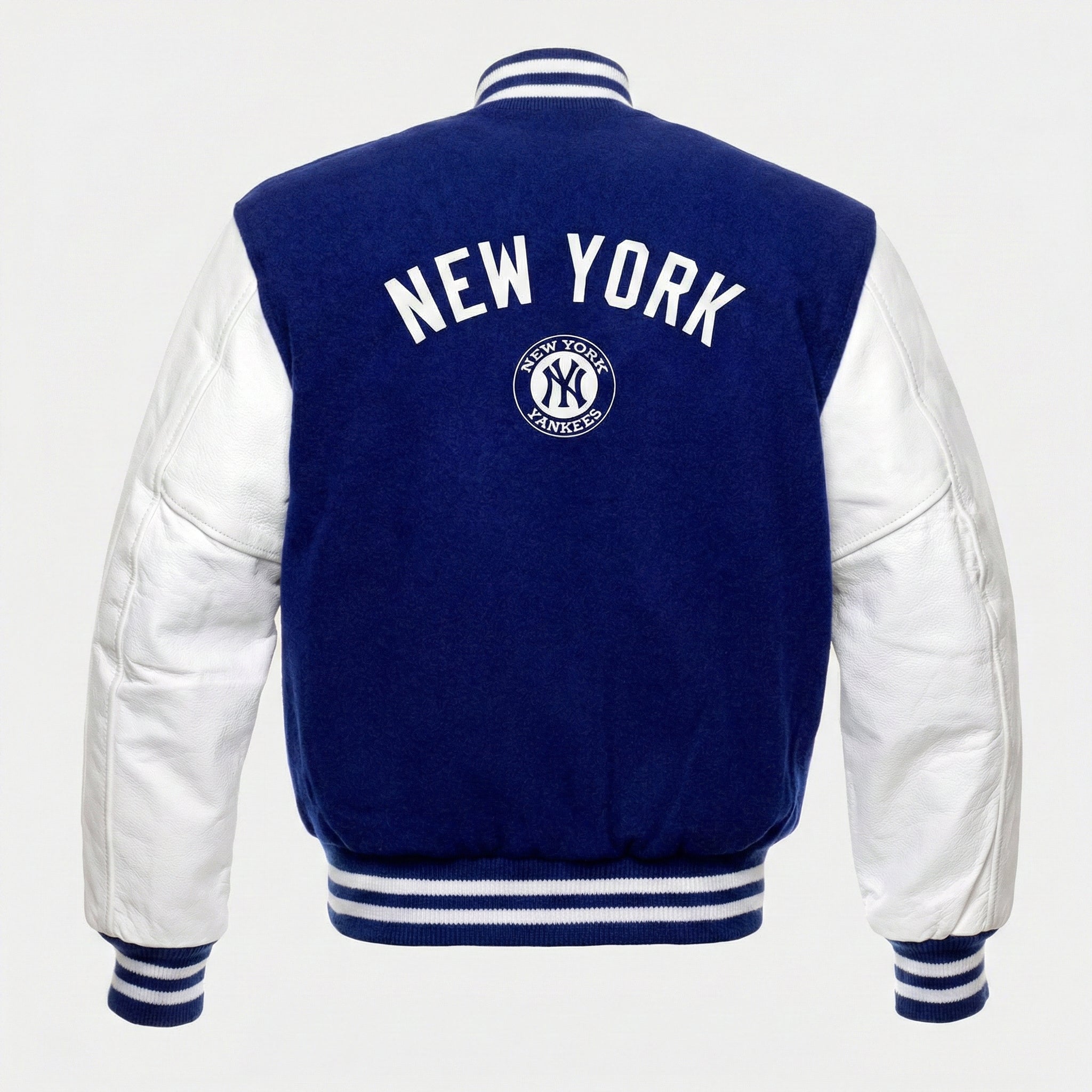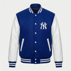 Show your support for the legendary New York Yankees with this Blue Varsity Jacket, designed to combine classic style and team pride. Featuring a wool body in striking blue with genuine white leather sleeves, this jacket offers both comfort and durability while highlighting your love for one of the most iconic teams in baseball.