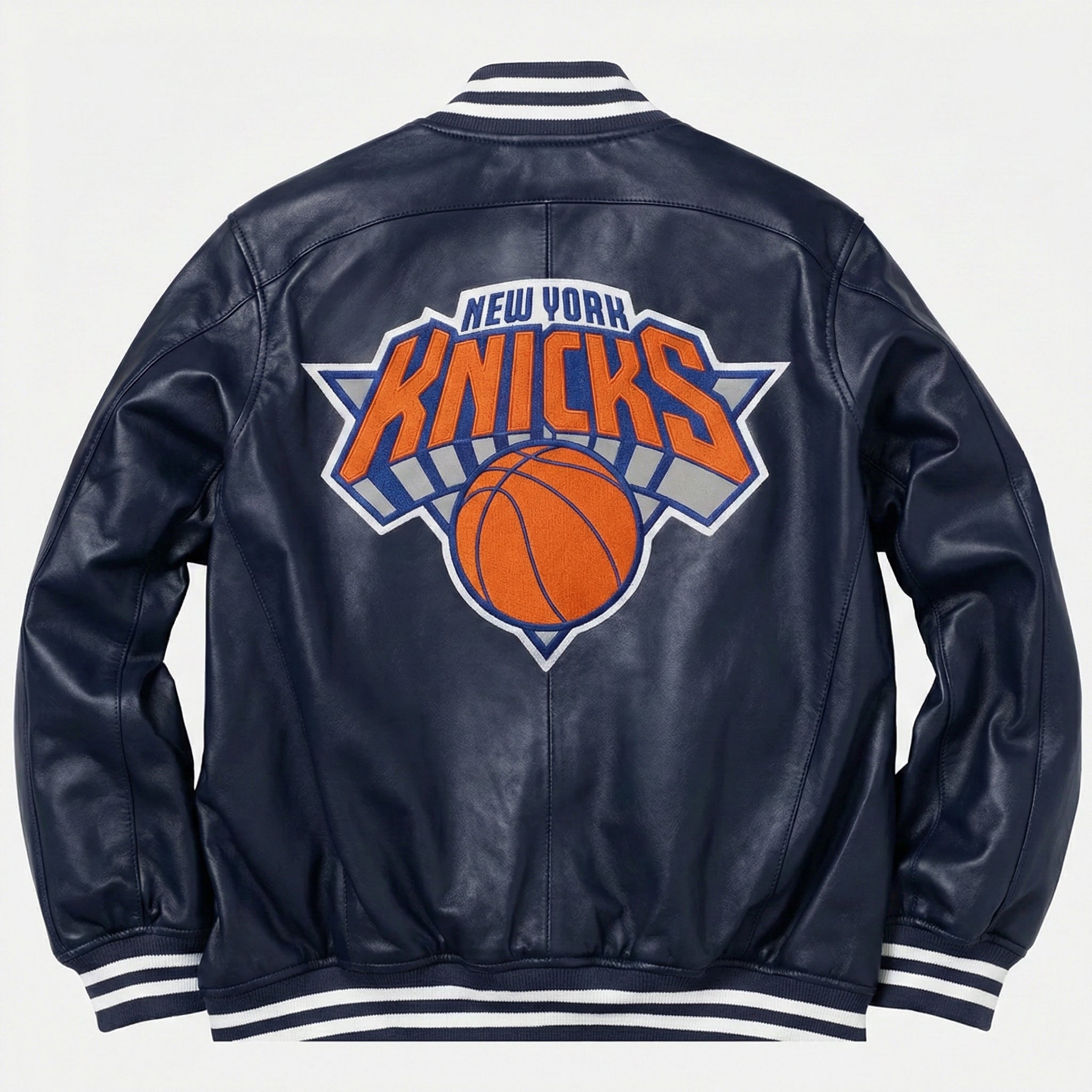 Show your New York Knicks pride with this premium navy blue varsity jacket crafted from genuine sheep leather. Designed for fans who demand authentic quality and timeless style, this jacket combines classic letterman aesthetics with the legendary spirit of Madison Square Garden.