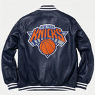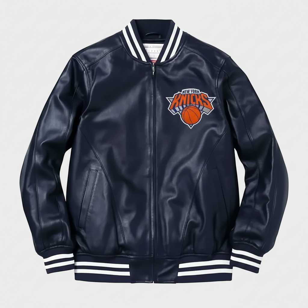 New York Knicks Navy Blue Genuine Sheep Leather Varsity Jacket – Premium NBA Fan Apparel