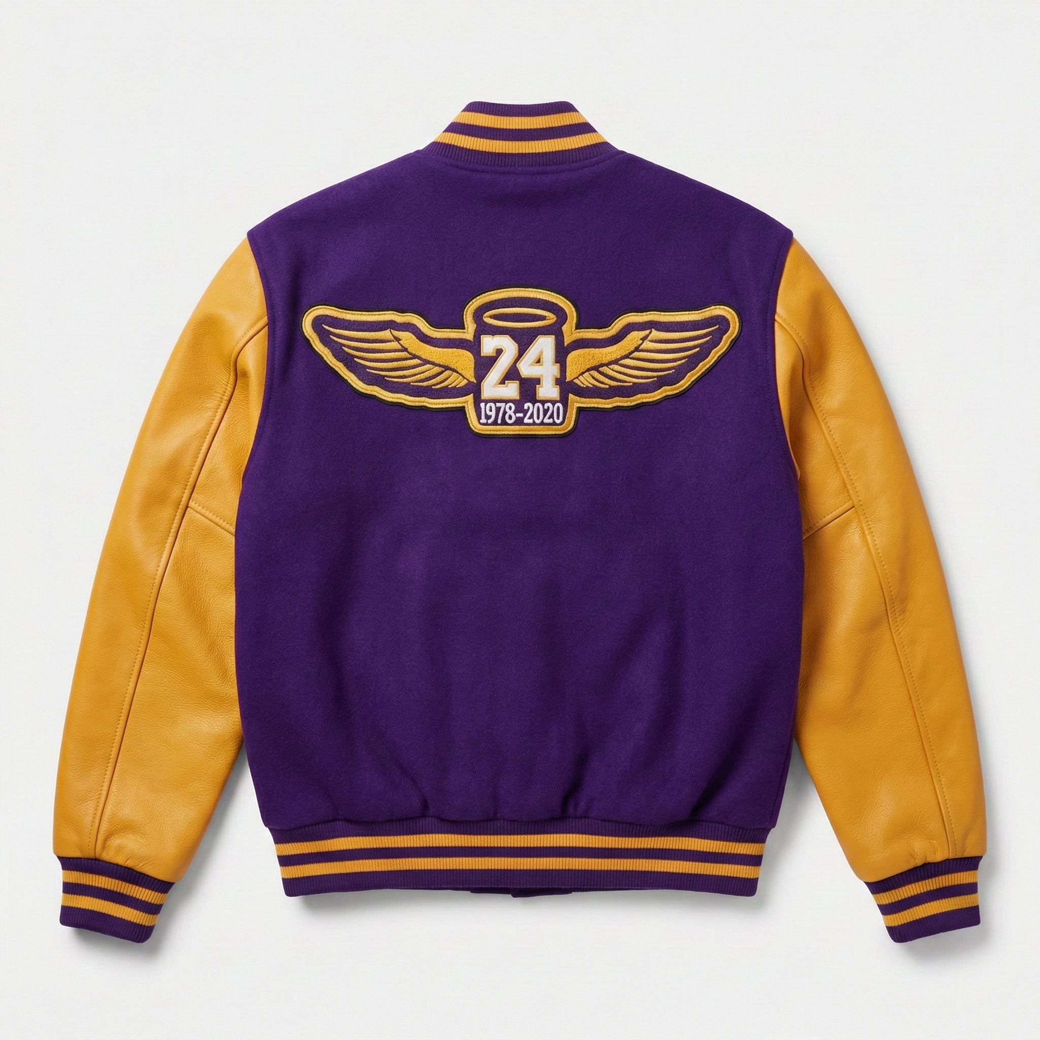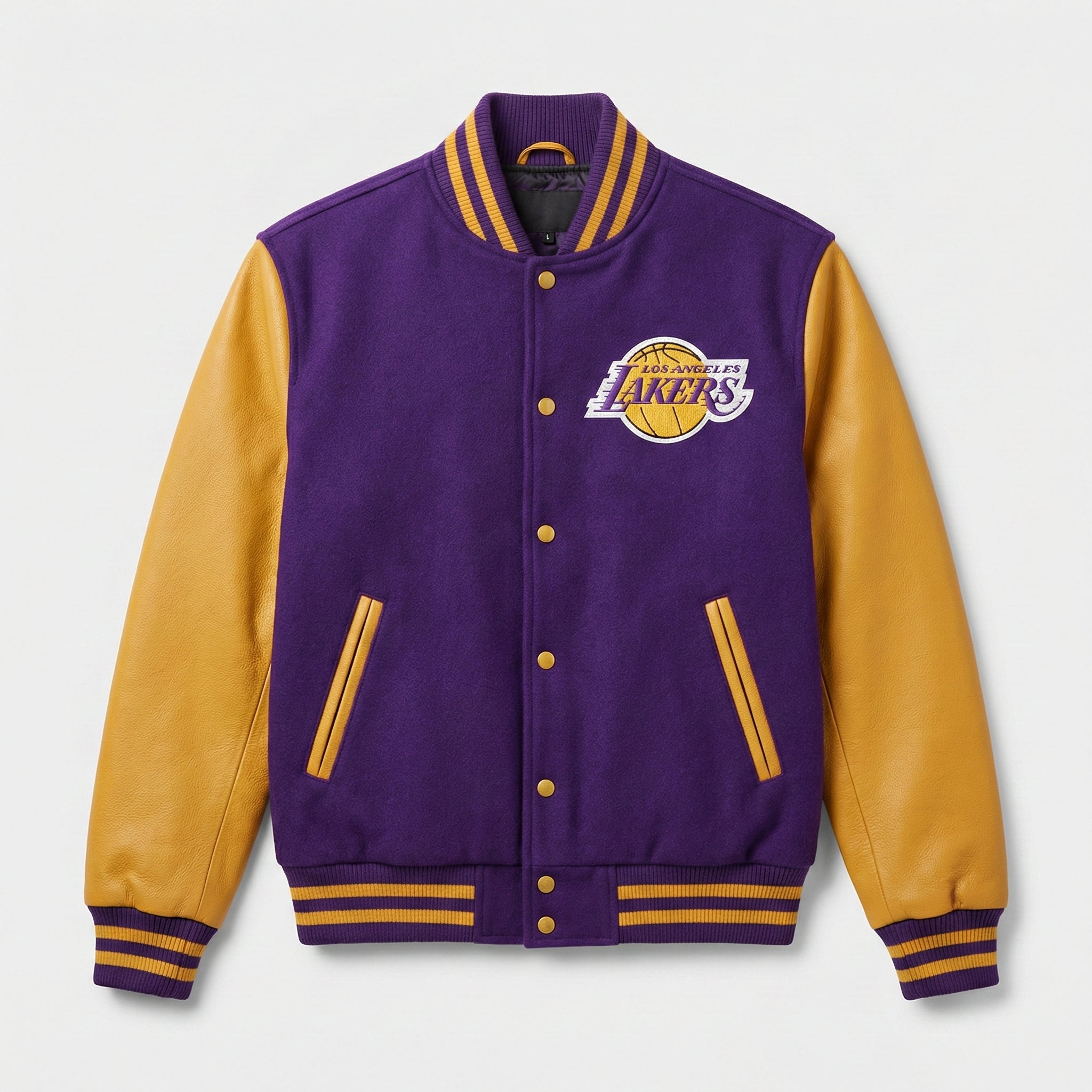 Celebrate the legacy of one of the NBA's most iconic teams with the Los Angeles Lakers Letterman Varsity Jacket. Designed for true fans, this jacket blends bold team pride with premium craftsmanship. The body is made from high-quality wool for warmth, while the sleeves are crafted from genuine leather, adding a sleek, durable edge to your game-day look.