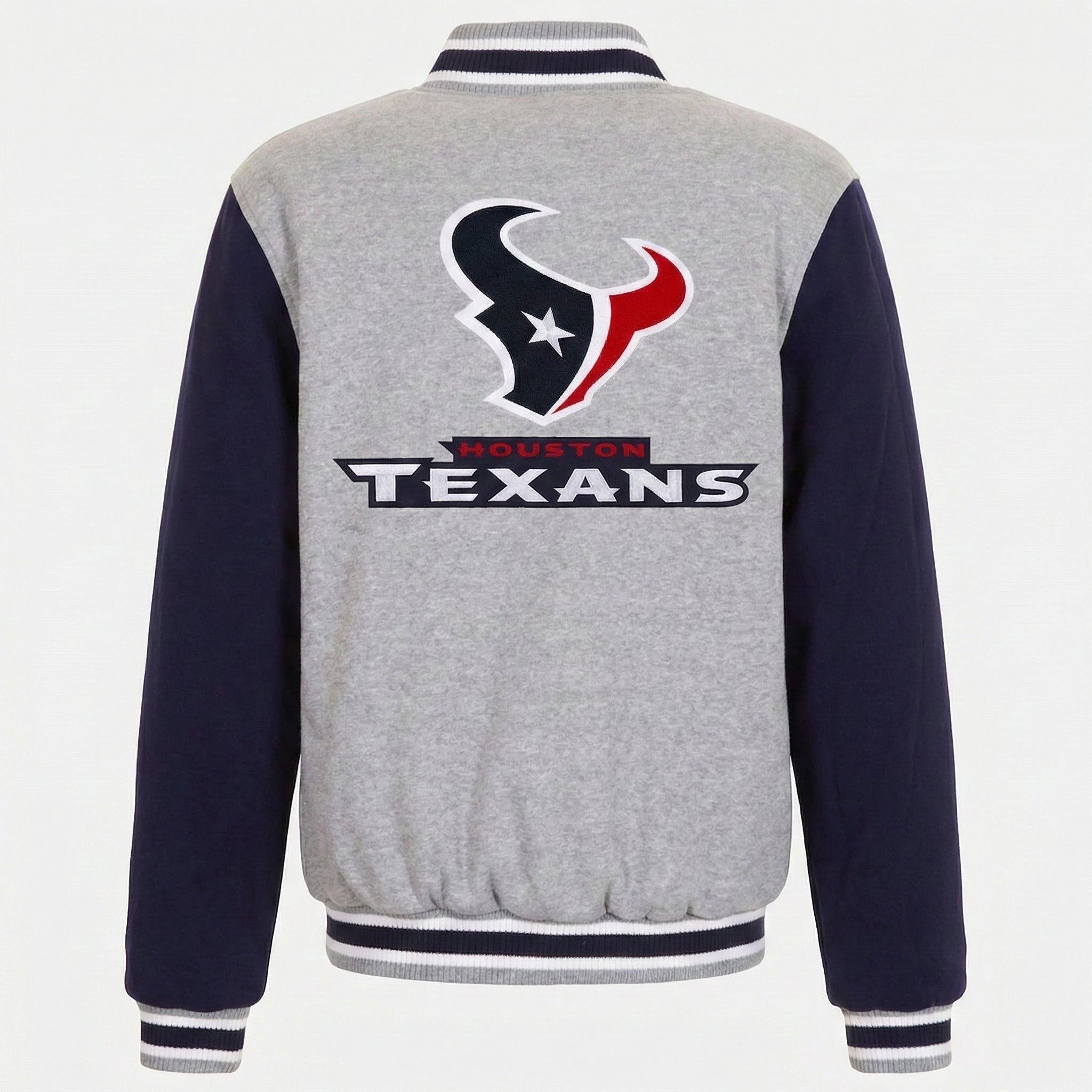 Show your support for the Houston Texans in this stylish Gray and Navy Varsity Wool Jacket. With its classic varsity design and premium wool construction, this jacket combines comfort, warmth, and bold team pride. The Houston Texans logo is embroidered on the front, making it a perfect choice for any fan looking to wear their team spirit with pride. Whether you're at the game or out on the town, this jacket will keep you cozy while you represent your favorite NFL team.