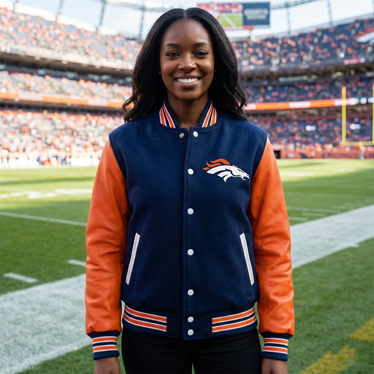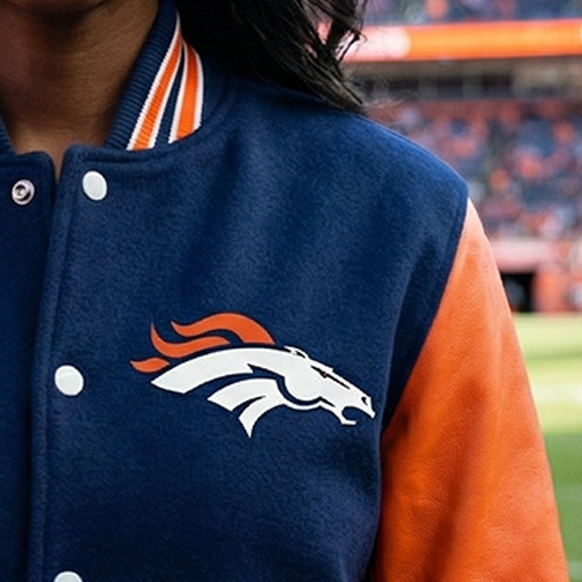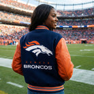 The embroidered Denver Broncos logo on the chest adds an authentic NFL touch, while ribbed trims and a snap-button closure complete the vintage varsity look. Whether you're at the stadium or out in the city, this jacket keeps you warm, stylish, and game-day ready.
