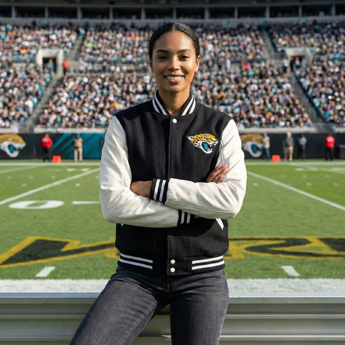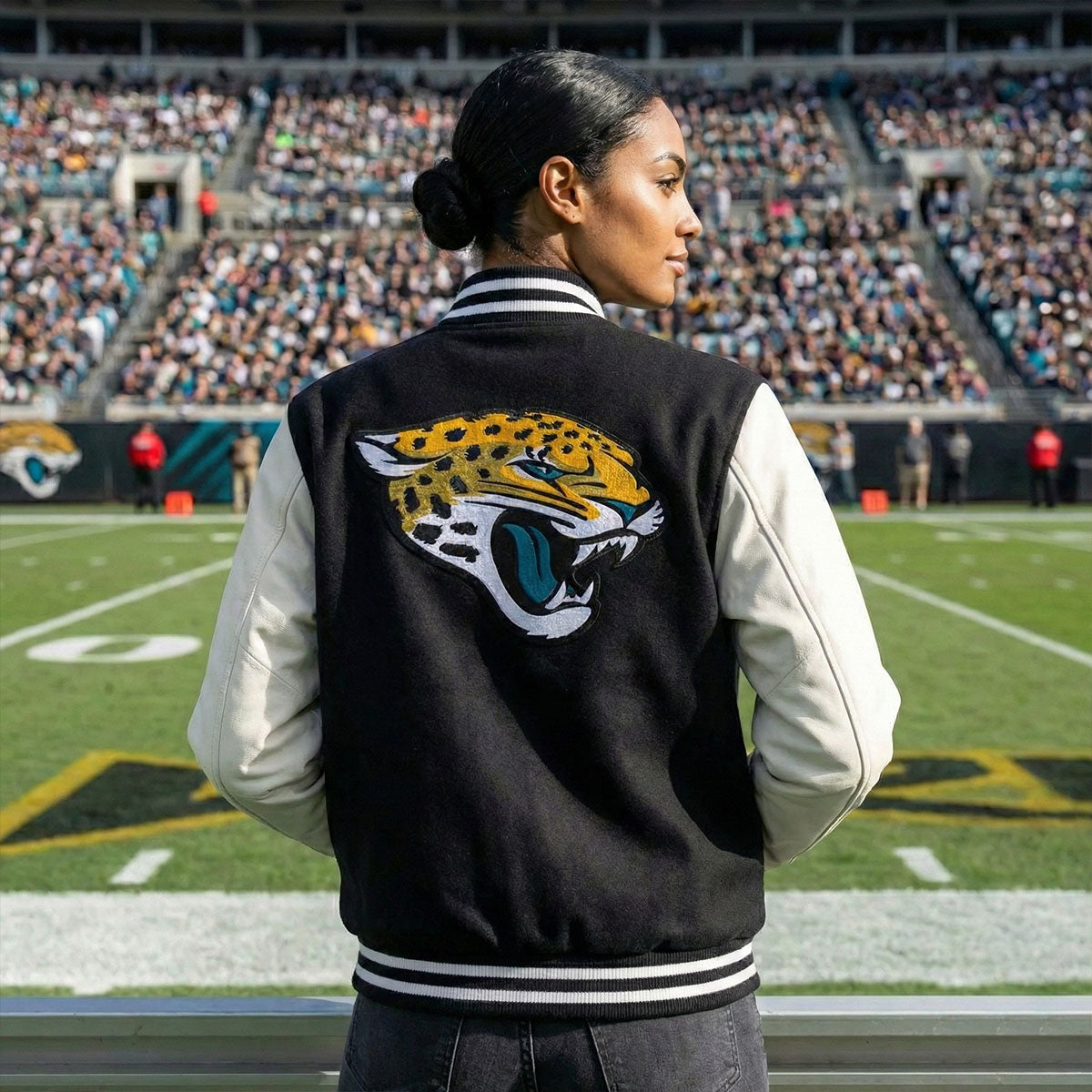 Show off your Jacksonville Jaguars pride in style with this black and white Letterman Varsity Jacket. Designed with a sleek, modern look, this jacket combines classic varsity styling with the bold team colors, making it the perfect addition to any fan’s wardrobe. The wool body provides warmth, while the genuine leather sleeves ensure durability and a premium feel.