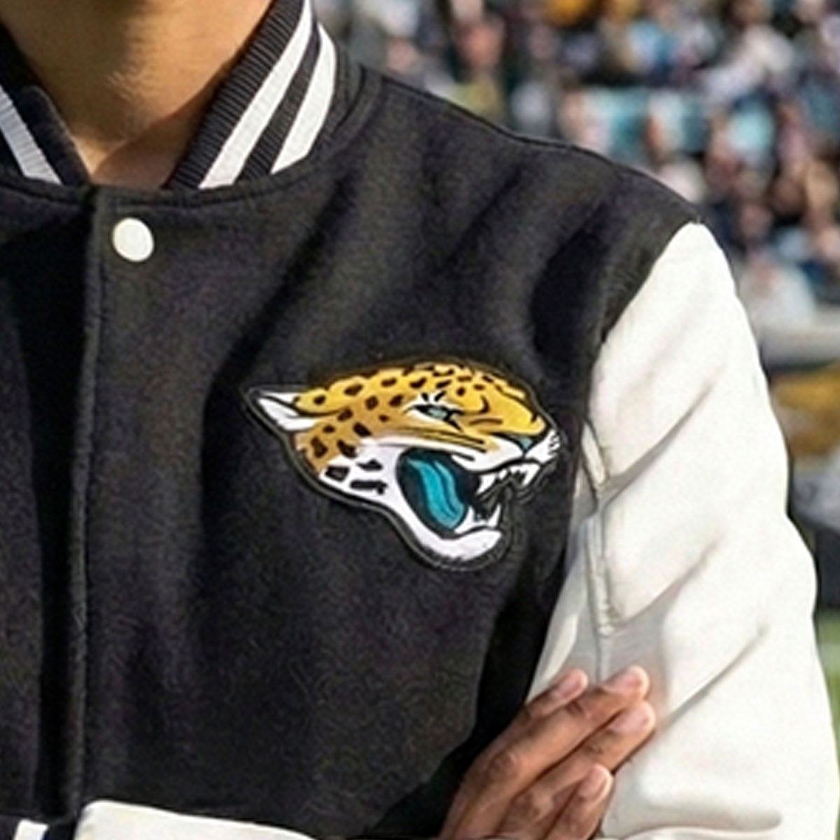 The embroidered Jacksonville Jaguars logo on the chest adds a touch of team spirit, while the snap-button front and ribbed cuffs, collar, and hem offer a comfortable fit with a traditional varsity vibe. Whether you're headed to the stadium or hanging out with friends, this jacket will keep you cozy and stylish.