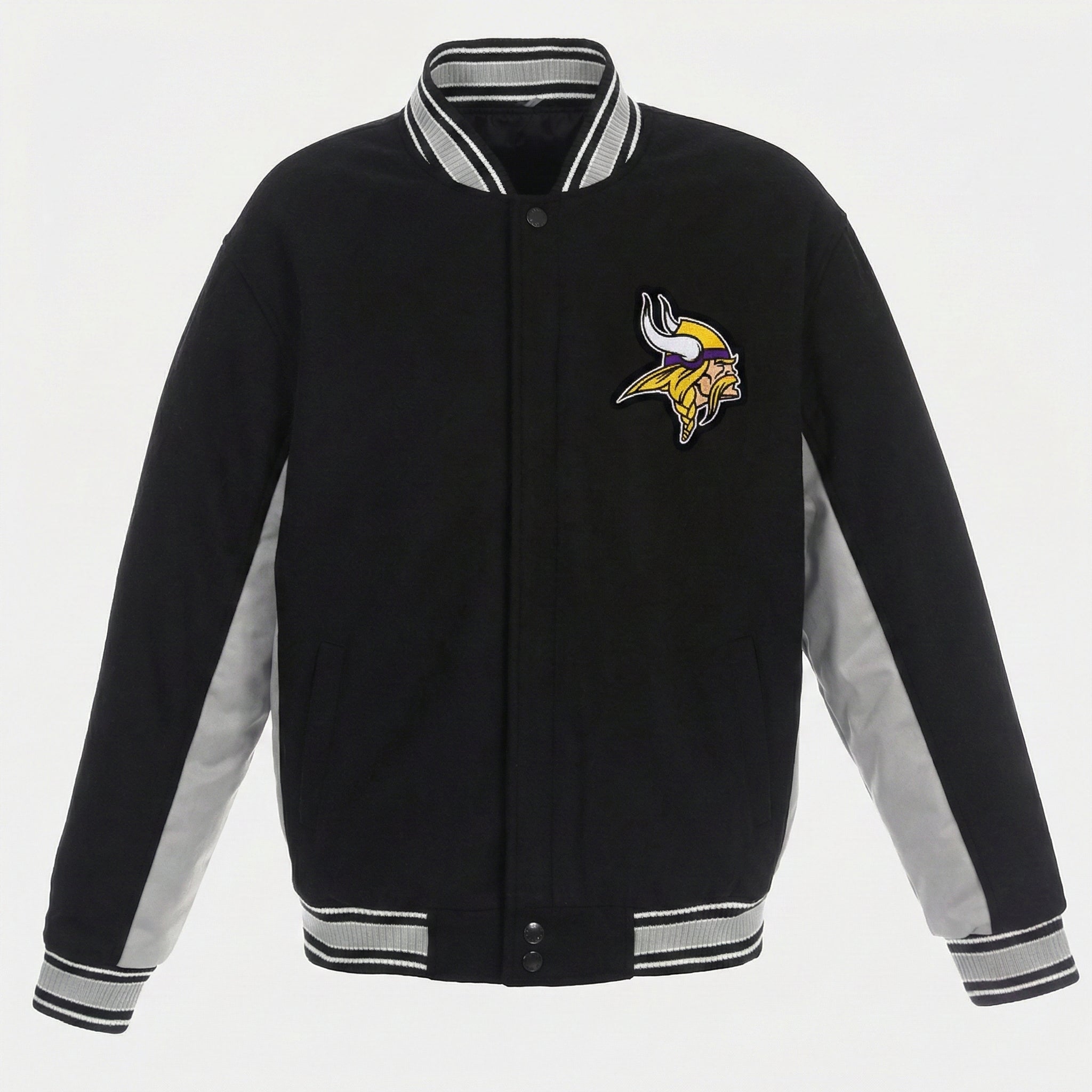 Rep the Minnesota Vikings with this sleek Black & Gray Wool Varsity Jacket. Featuring a classic varsity design, this jacket combines the bold colors of black and gray, offering a stylish look that showcases your team spirit. With the iconic Minnesota Vikings logo embroidered on the chest, this jacket is the perfect way to support your team in comfort and style. Whether you're cheering from the stadium or hanging out with friends, this jacket keeps you warm and fashionable.
