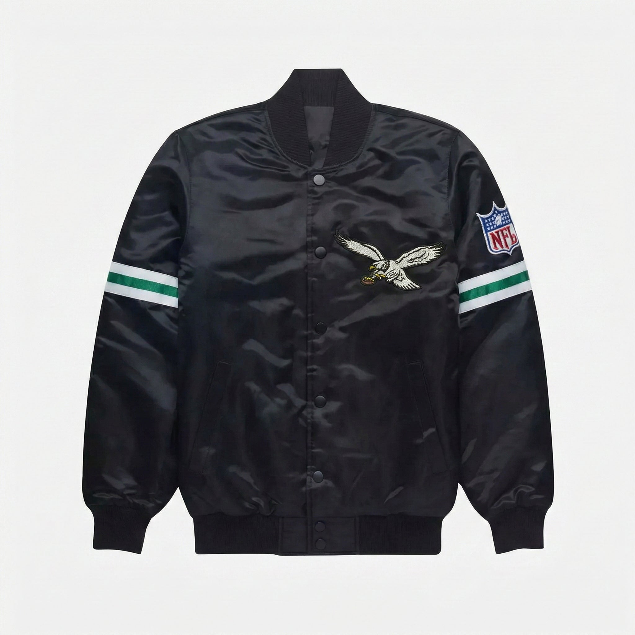 Make a bold statement in Eagles black with this sleek satin varsity jacket featuring full-snap closure and embroidered team logos. Designed for fans who want a modern, edgy look with authentic team spirit, this letterman jacket delivers classic NFL style with a refined satin finish.