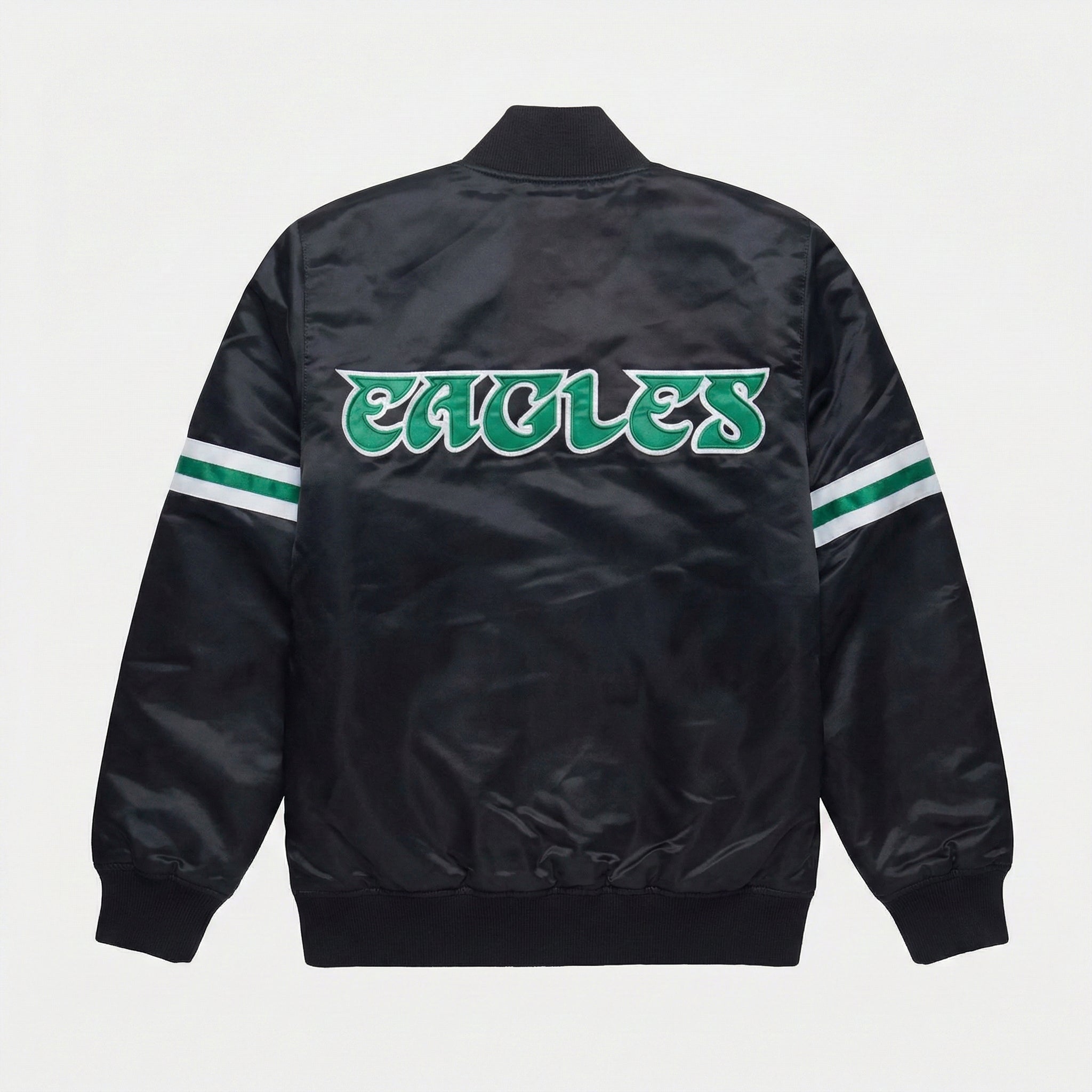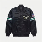 This black satin varsity jacket offers a contemporary, edgy take on traditional letterman style. The sleek black finish creates a versatile look that works from the stadium to the street. The lightweight satin fabric makes it ideal for milder game days or as a statement layer year-round. Whether you're at Lincoln Financial Field or out on the town, the embroidered logos and polished finish ensure you rep your Eagles in bold style.