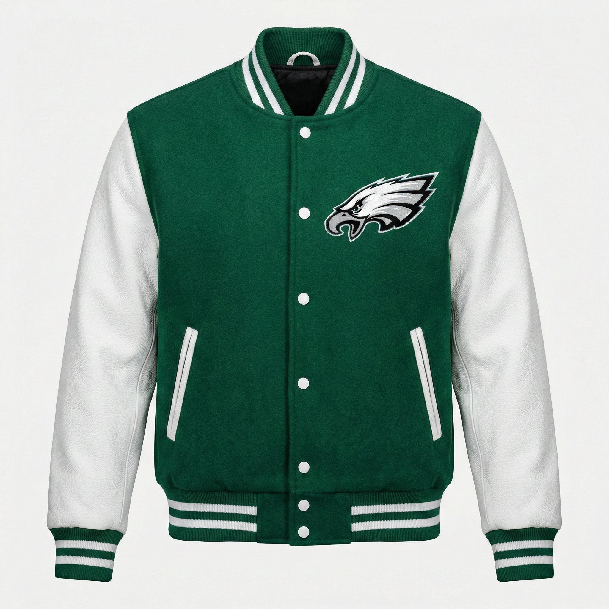 Elevate your Eagles fandom with this striking green wool varsity jacket featuring crisp white leather sleeves. Designed for fans who refuse to compromise on quality or style, this letterman jacket delivers authentic NFL team spirit with premium craftsmanship.