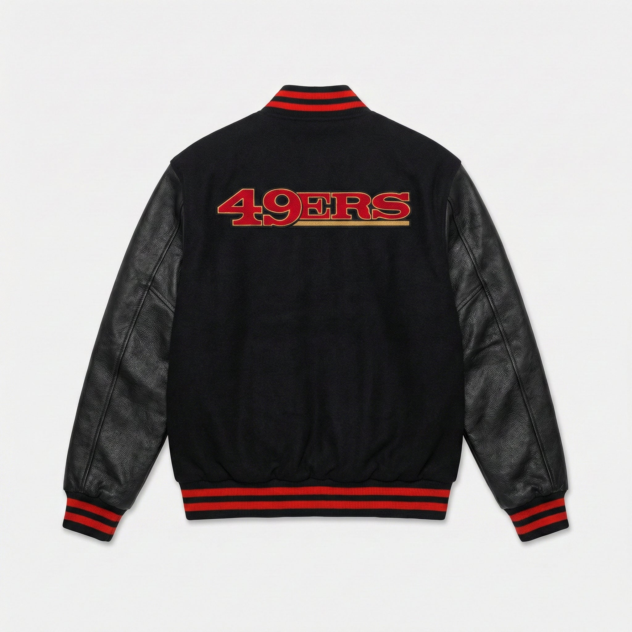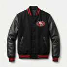 Show off your team pride with the San Francisco 49ers NFL Varsity Jacket, designed with genuine leather sleeves for a sleek, modern look. The classic black wool body is complemented by the bold 49ers logo embroidered on the chest, making it a perfect choice for any dedicated fan. Whether you’re at the game or out on the town, this jacket ensures you stay comfortable while showcasing your loyalty to the 49ers.