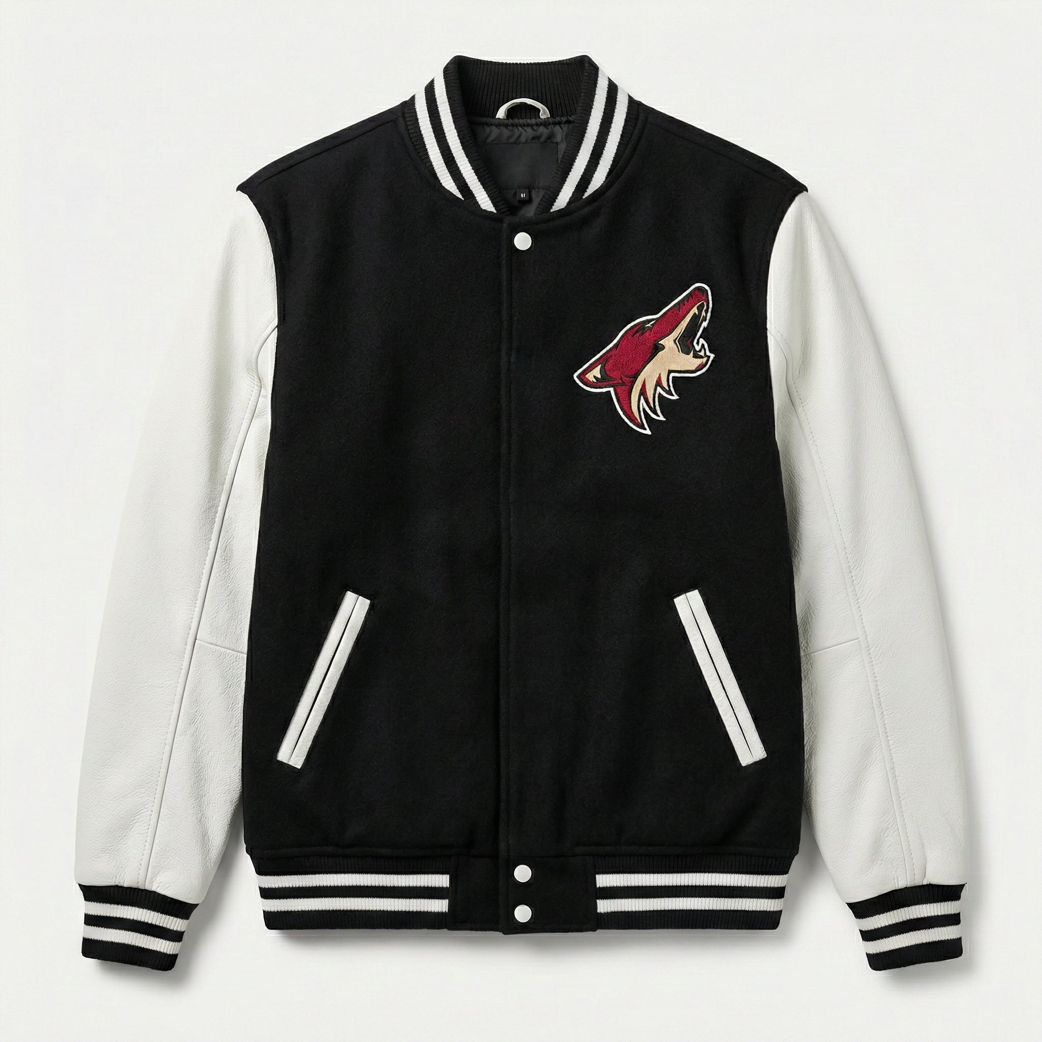Showcase your Arizona Coyotes pride with this sleek black and white varsity jacket. Designed for dedicated fans who appreciate premium quality and timeless style, this jacket combines classic varsity heritage with authentic NHL team spirit.