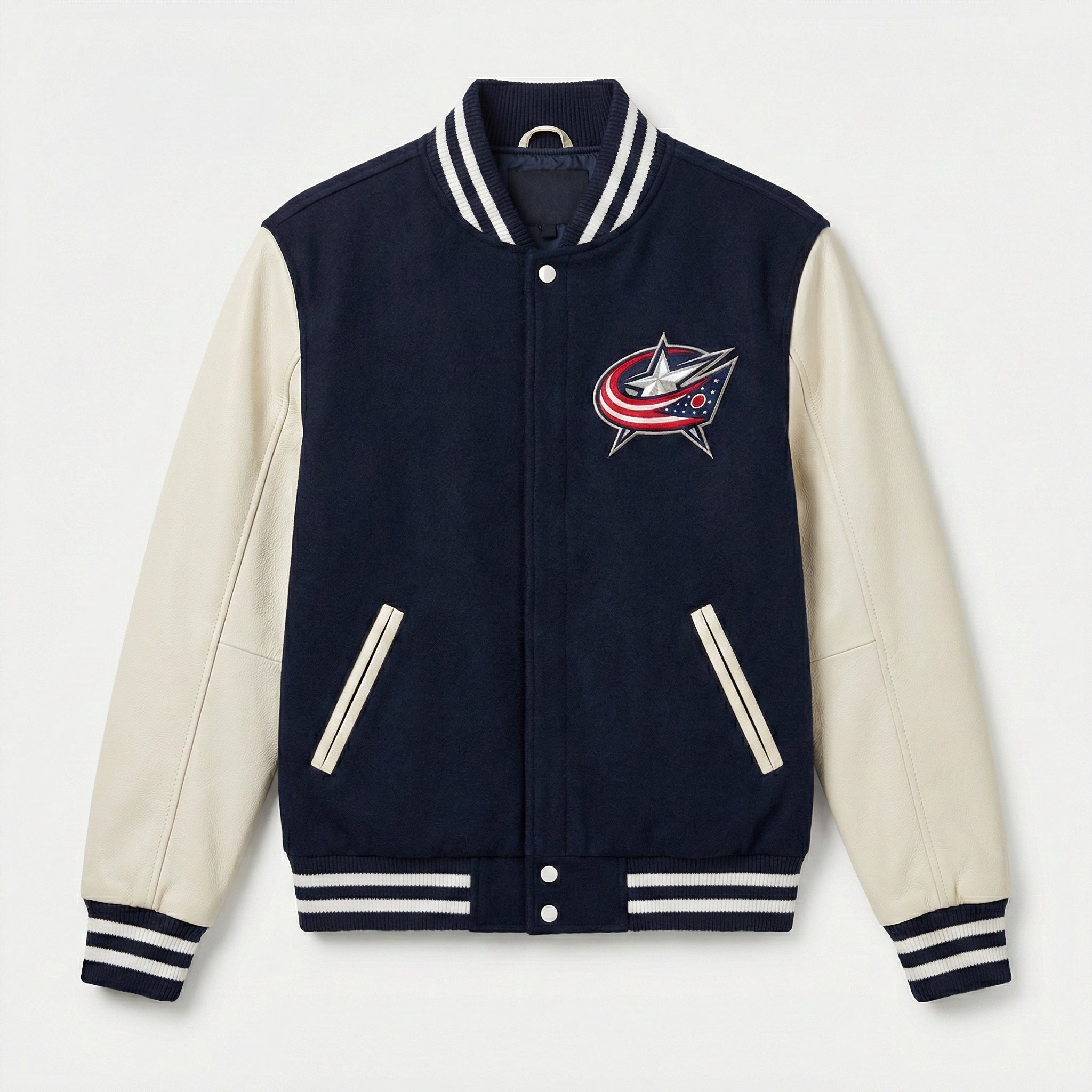 Show your Columbus Blue Jackets pride with this striking blue and white varsity bomber jacket. Designed for dedicated fans who appreciate premium quality and authentic team style, this jacket delivers both comfort and championship-worthy looks.