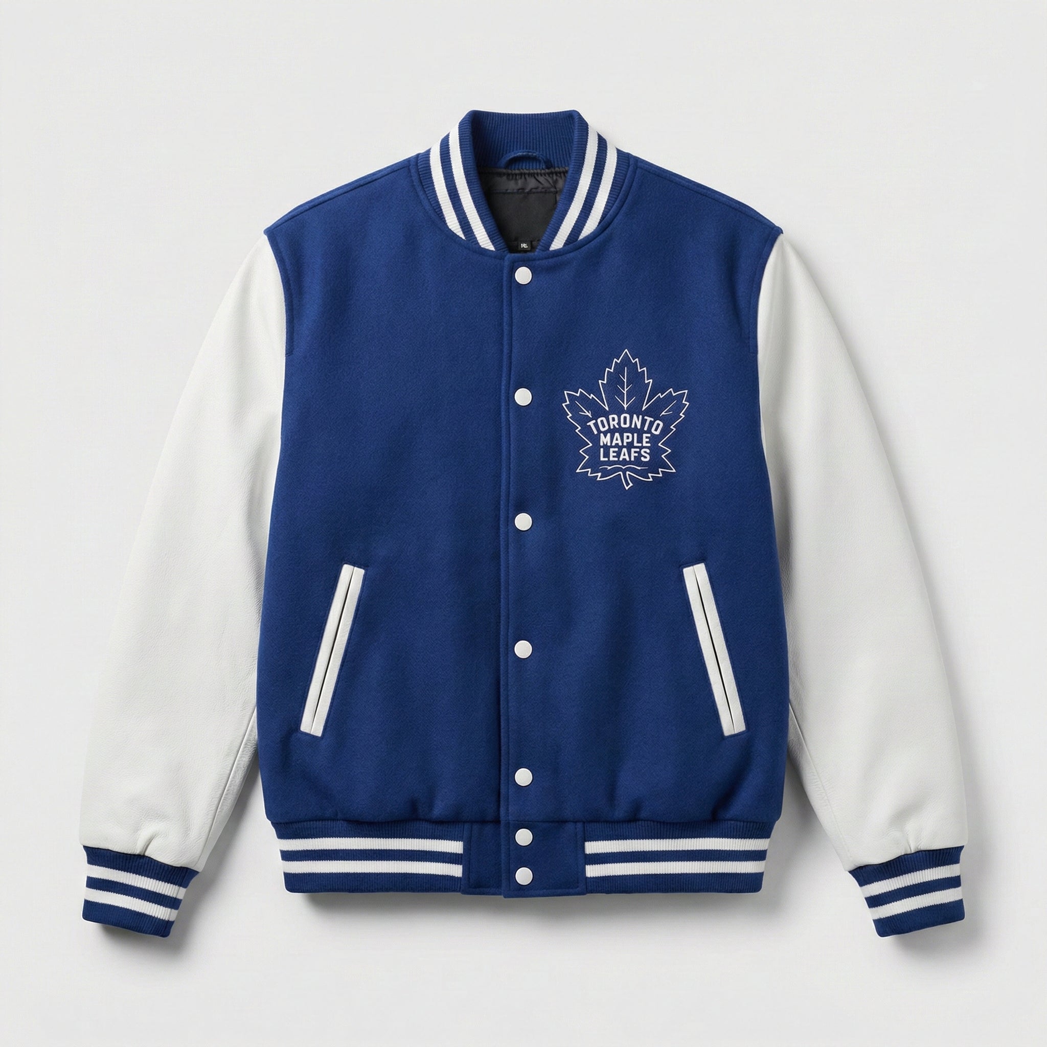 Represent the legendary Toronto Maple Leafs with this premium letterman-style varsity jacket. Designed for devoted fans who appreciate authentic team spirit and classic athletic style, this jacket brings together iconic blue and white team colors with superior craftsmanship.