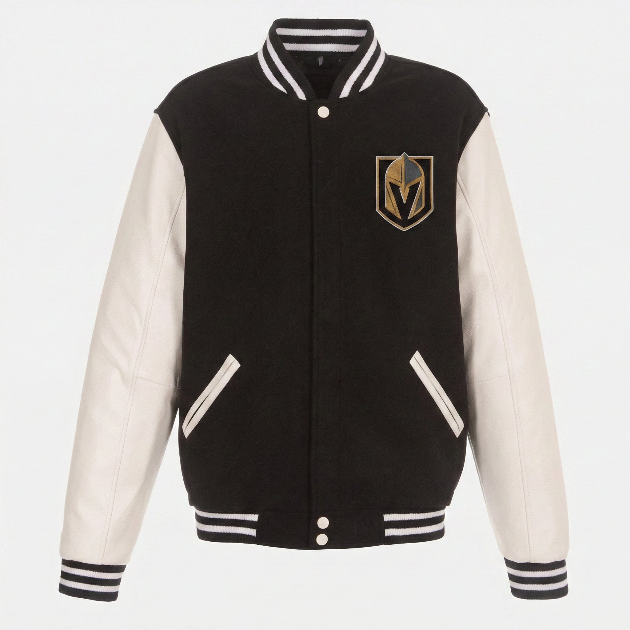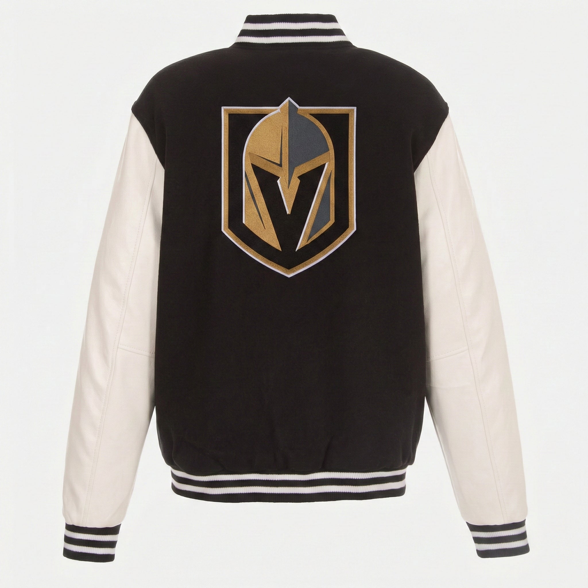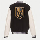 This letterman jacket showcases a bold black and white color scheme, creating a sophisticated look that honors the Golden Knights' winning tradition. The timeless design delivers both style and team pride in every detail.