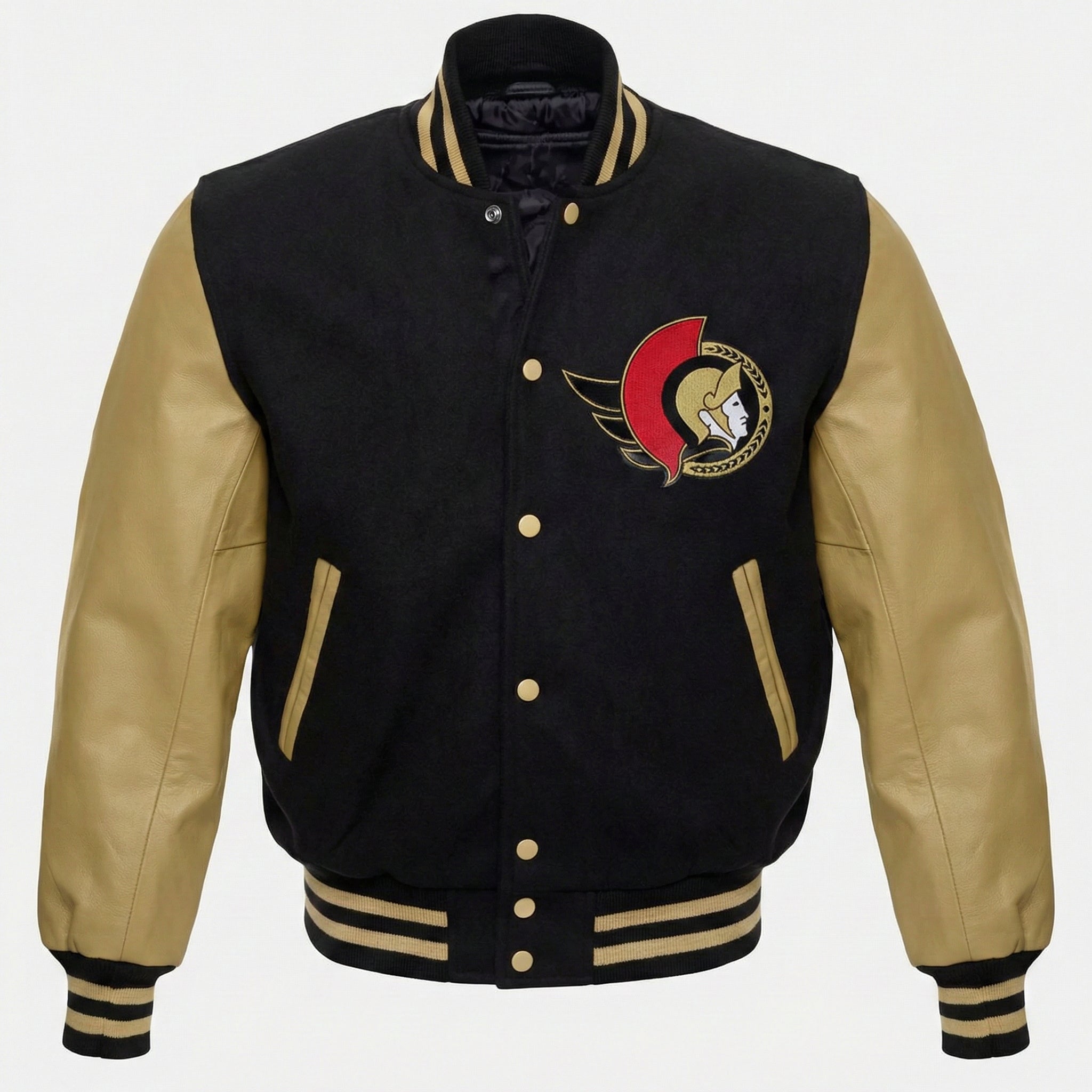 Represent your Ottawa Senators pride with this classic letterman-style varsity jacket. Designed for devoted fans who appreciate authentic team style and premium craftsmanship, this jacket combines traditional varsity heritage with genuine leather sleeves for a timeless look.