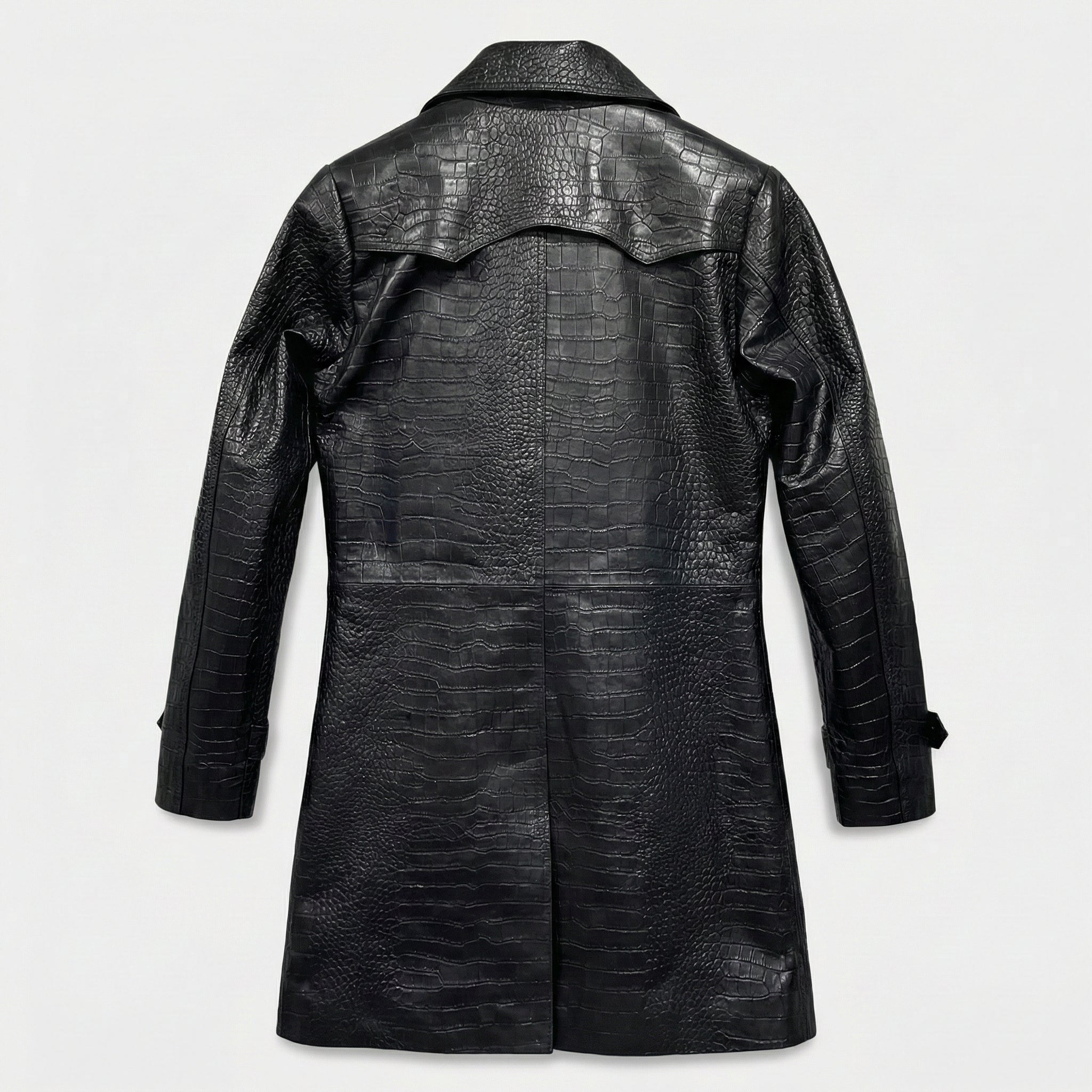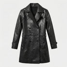 Women's Black Croco Embossed Classic Trench Coat Real Leather Long Fashion Coat