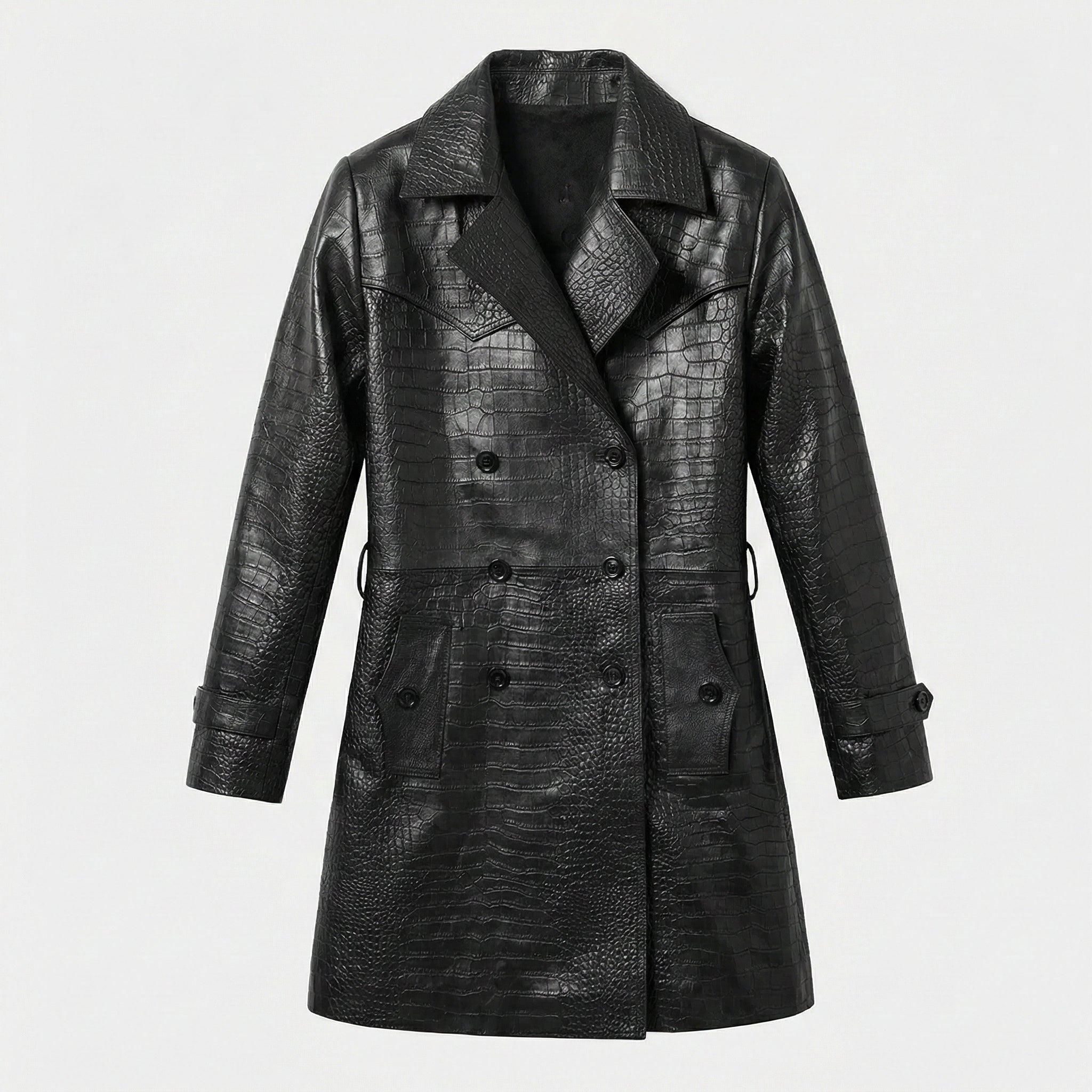 The Women’s Black Croco Embossed Classic Trench Coat is a sophisticated and luxurious addition to any wardrobe. Crafted from high-quality real leather with a striking croco embossed pattern, this long fashion coat offers a unique texture that adds depth and elegance. The classic trench silhouette, complete with a belt and double-breasted design, provides a flattering and timeless fit. Perfect for both formal and casual occasions, this coat ensures you stay warm, stylish, and confident throughout the season.