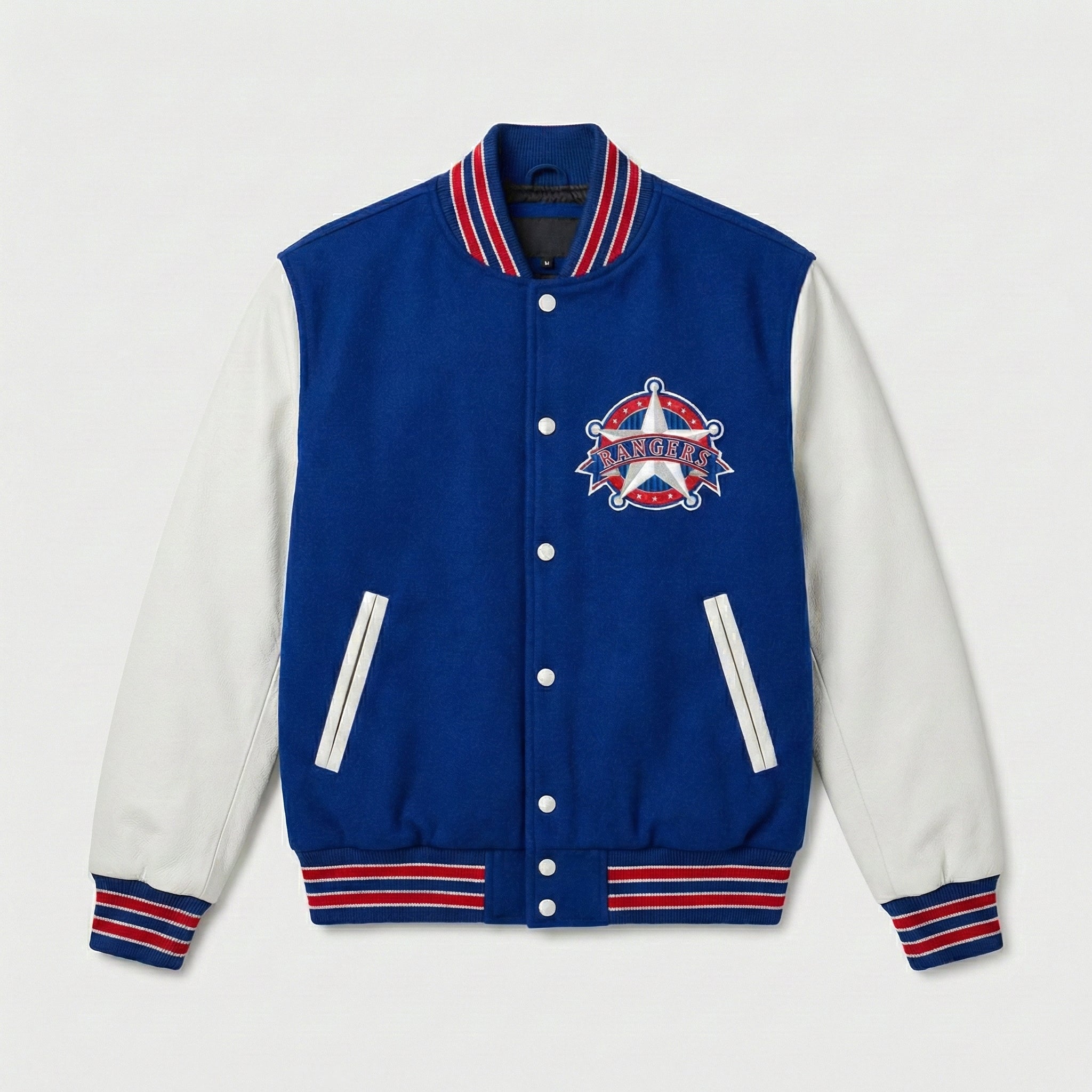 Bring the HeatGet ready to knock it out of the park with this Texas Rangers varsity jacket! Featuring a classic blue and white design with genuine leather sleeves, this jacket is perfect for baseball fans and anyone looking for a stylish throwback look.