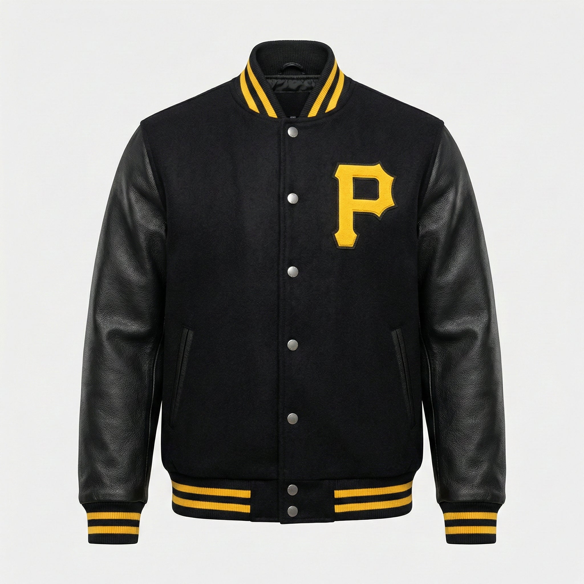 Represent your team in style with the Pittsburgh Pirates Letterman Varsity Jacket, designed with a sleek black wool body and genuine leather sleeves. This varsity jacket combines durability with classic style, making it the ultimate choice for any Pittsburgh Pirates fan.