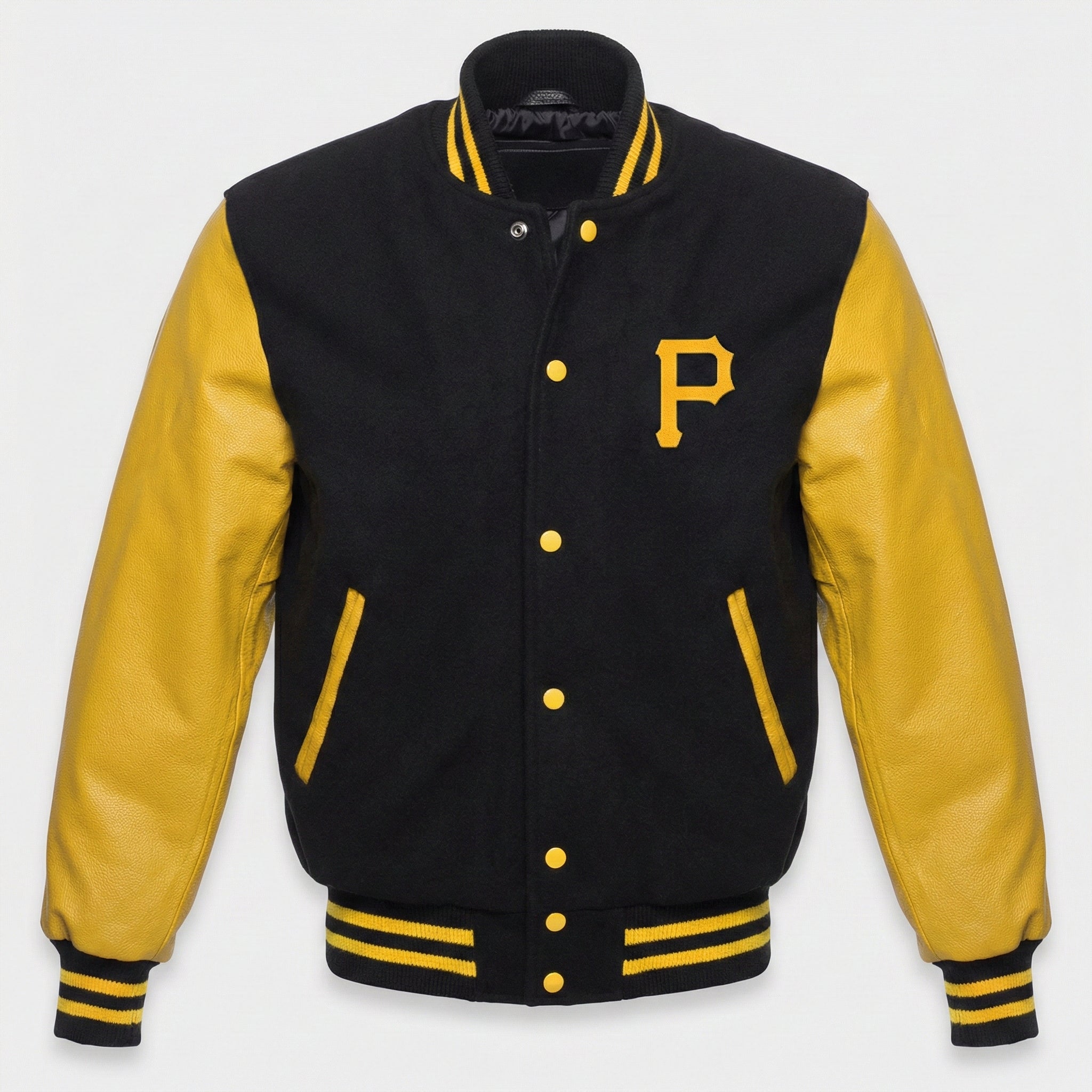 Show your team pride with the Pittsburgh Pirates Varsity Jacket, crafted from high-quality wool and featuring genuine leather sleeves. This bold jacket combines the iconic yellow and black team colors, making it the perfect addition to any Pirates fan’s collection. Whether you're at the game or hanging out with friends, this jacket will keep you stylish and cozy.