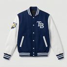 Show off your love for the Tampa Bay Rays with this classic Varsity Jacket. Featuring a sleek blue and white wool body with genuine leather sleeves, this jacket combines sporty style and premium quality. It's the perfect way to represent your team while staying comfortable and on-trend.