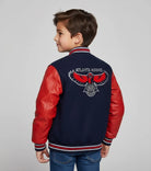 This classic varsity jacket sports vibrant blue and red team colors, complemented by embroidered Atlanta Hawks logos on the chest and back. The full-snap button front, rib-knit cuffs, collar, and hem, and a smooth quilted lining ensure comfort, warmth, and a true vintage letterman look.
